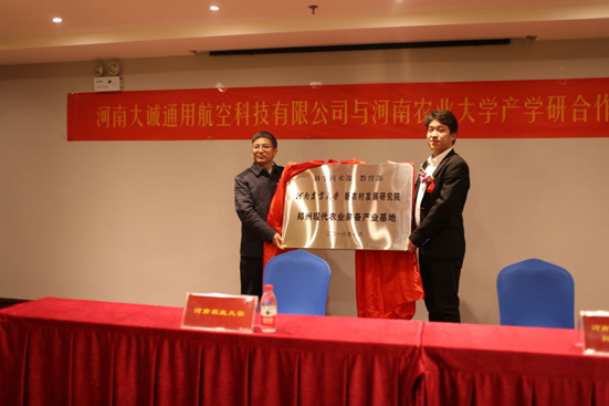 科技合作管理办公室主任贺徳先为河南大诚通用航空科技有限公司总经理尹路授牌)