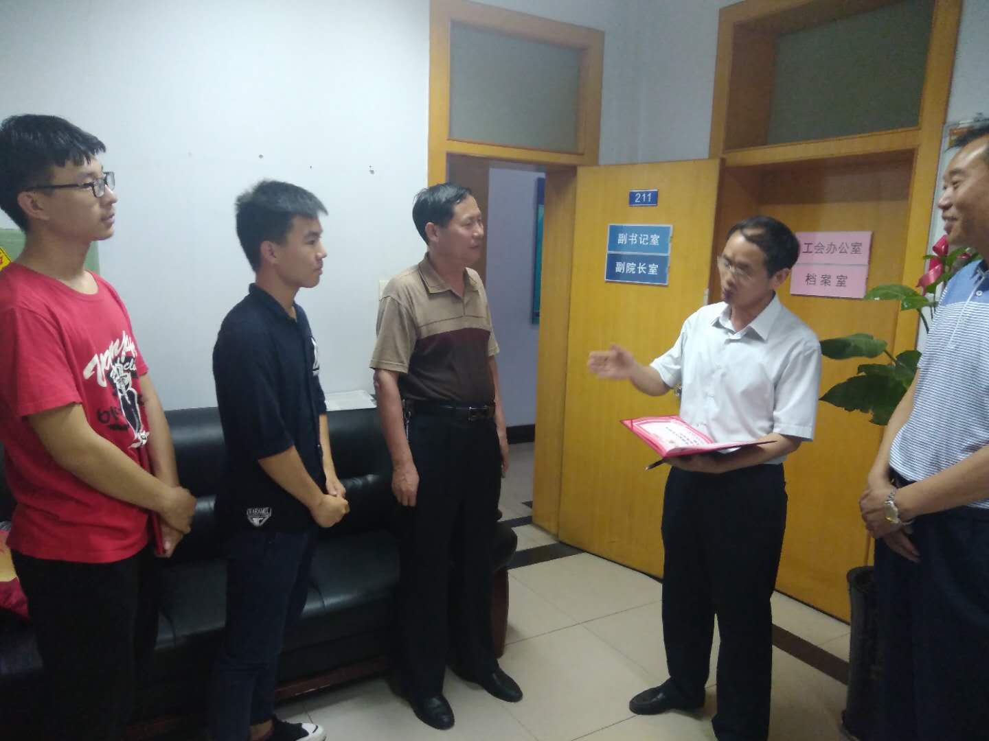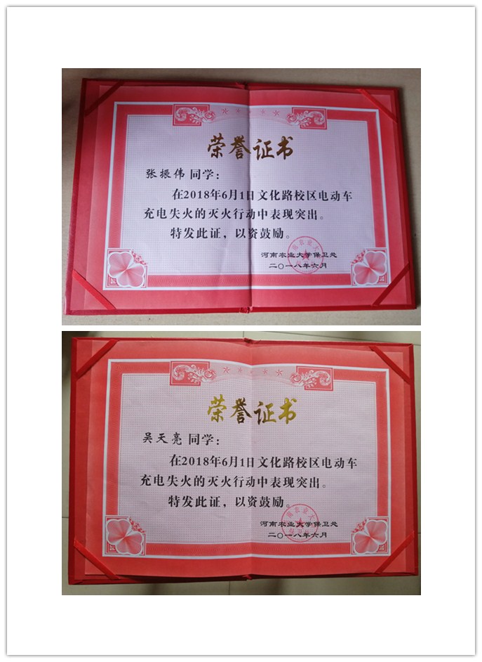 6月7日上午,校保卫处领导在15号楼为两位同学颁发了荣誉证书。校保卫处领导对两位同学勇敢的行为表示了肯定,并希望两位同学能够继续发扬这种见义勇为精神,向身边同学们宣传消防知识,提高同学们的消防意识和火灾处理能力,防止类似情况的再一次发生。