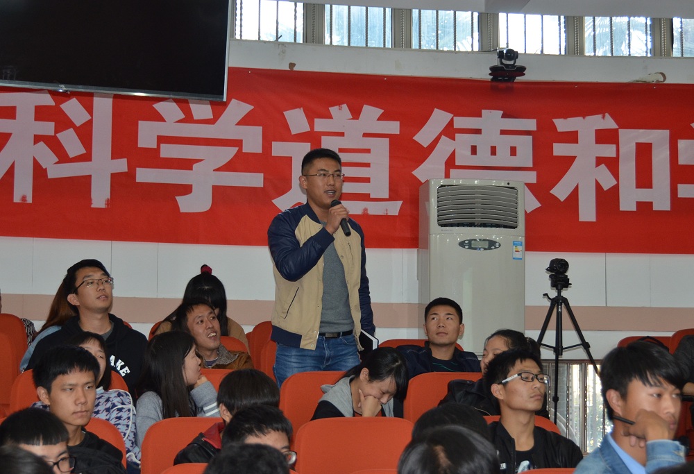 活动中,王万章教授围绕“科学道德、科研创新能力及素质、科学规范”三方面展开宣讲,分享了自己艰苦求学、从一名学生成长为一位学者的经历,分析了本科生、硕士生、博士生应该具备的科学研究和科技创新素质及能力,强调学风建设对大学生学好专业知识、培养综合素质的重要性,结合案例讲解了大学生在进行专业学习、科研创新时可能会违反的学术规范和科学道德,强调了遵守科学道德的重要意义。王教授还对与会师生提出了希望,希望我校学生要严于律己、求真务实,恪守科学道德,坚决抵制学术不正之风,营造风清气正、严谨求实的校园氛围,成长为知行合一、诚信有为的新时代青年。互动环节中,王教授还就与会师生提出的问题进行了解答和探讨。报告会内容丰富、气氛热烈,现场掌声阵阵。