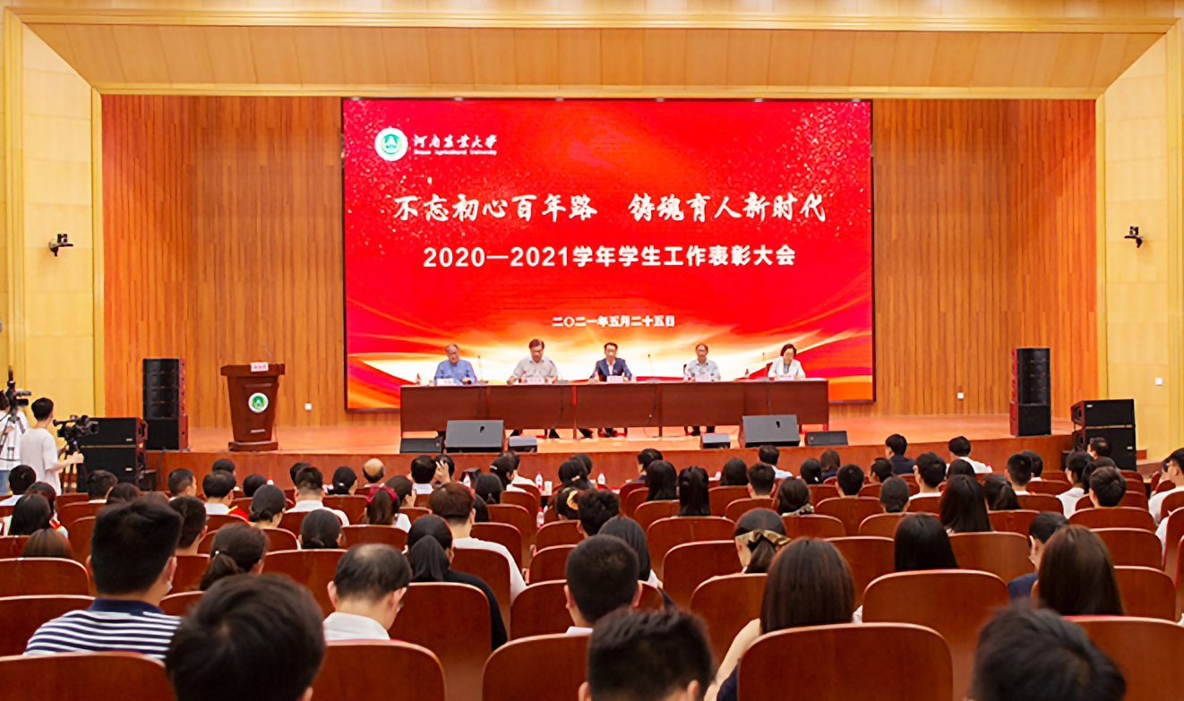 5月25日晚,我校“不忘初心百年路 铸魂育人新时代”2020-2021学年学生工作表彰大会在龙子湖校区召开,校党委书记魏蒙关、校长介晓磊、校党委副书记、工会主席李成吾、副校长尹新明、副校长林同保出席大会。学校相关部门负责人、全校政工干部、班主任代表、学生代表参加大会。