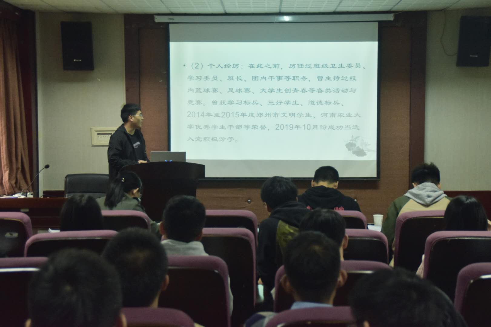 于学院报告厅举办“大学生职业生涯规划大赛”决赛。院团委副书记宋东皓、团委老师徐捧丽、院兼职辅导员张鹏飞、赵志强担任此次决赛评委,19级能源一班杨鑫担任主持。