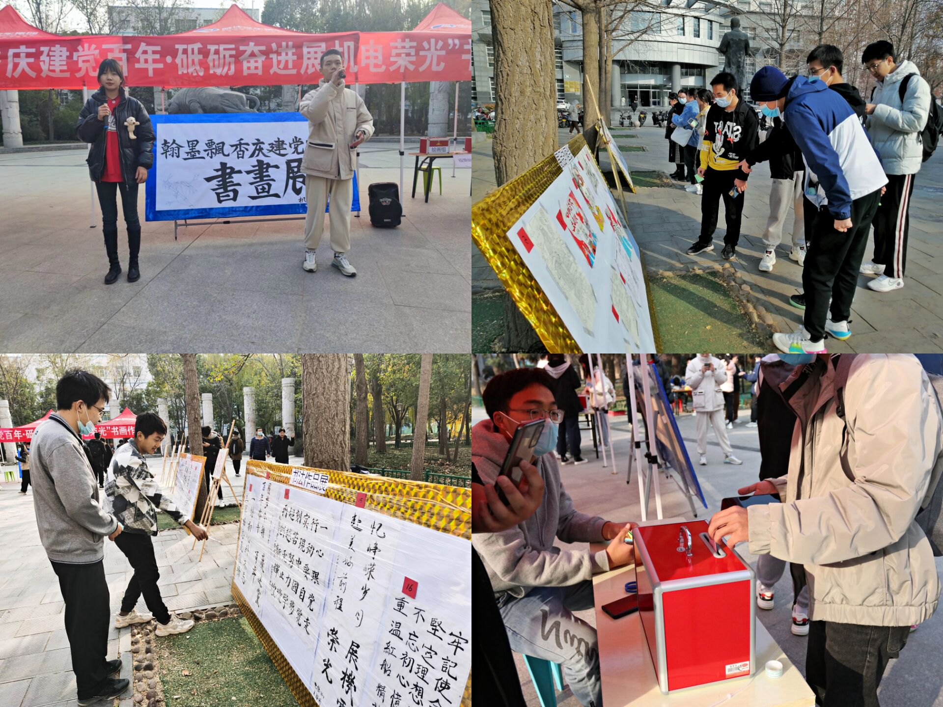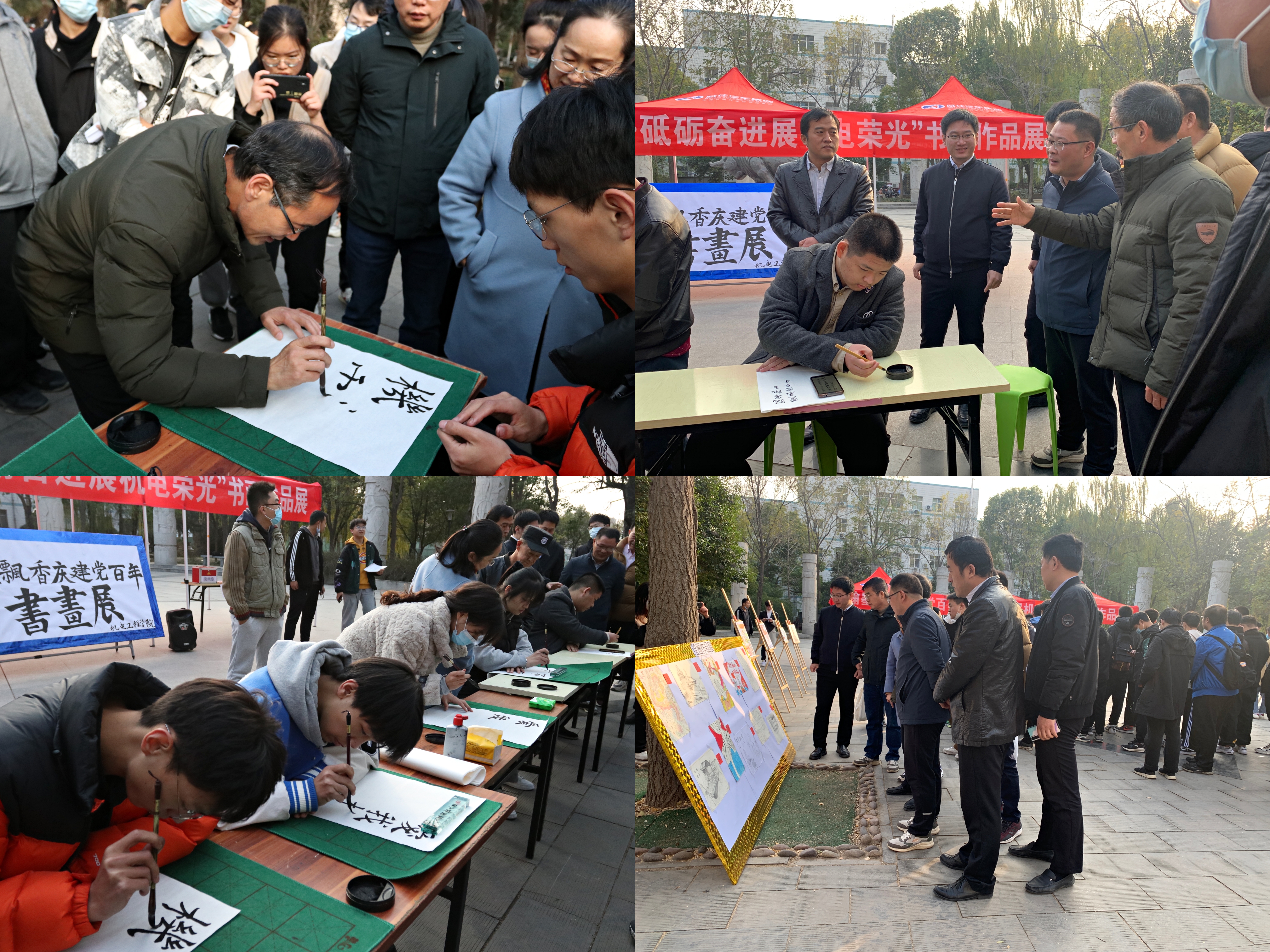 于文化路校区工程楼南广场举行“翰墨飘香庆建党百年,砥砺奋进展机电荣光”书画展活动。院党委书记李世欣,院长胡建军,党委副书记赵宁,副院长刘淑杰、胡建东、王振锋,团委书记黄笑,农机系教授李保谦出席此次活动,广大学子积极参加。