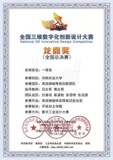吕志军、黄会男老师指导的“高效辣椒移栽创新团队”(本科生队员:任春培、崔涵勃、张雪明、张洺源)凭借作品《高效辣椒钵苗移栽试验台架》取得大赛(数字工业方向)一等奖,由91猫先生