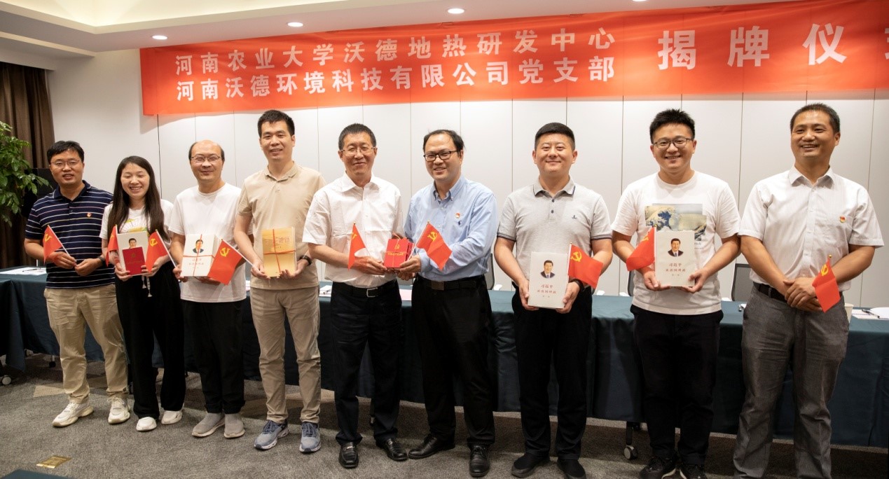 沃德地热研发中心揭牌;李成吾和郭凤春共同为河南沃德环境科技有限公司党支部揭牌;贺超代表能源系教工党支部向沃德环境有限公司党支部捐赠了党建资料。 (图/文:党钾涛)