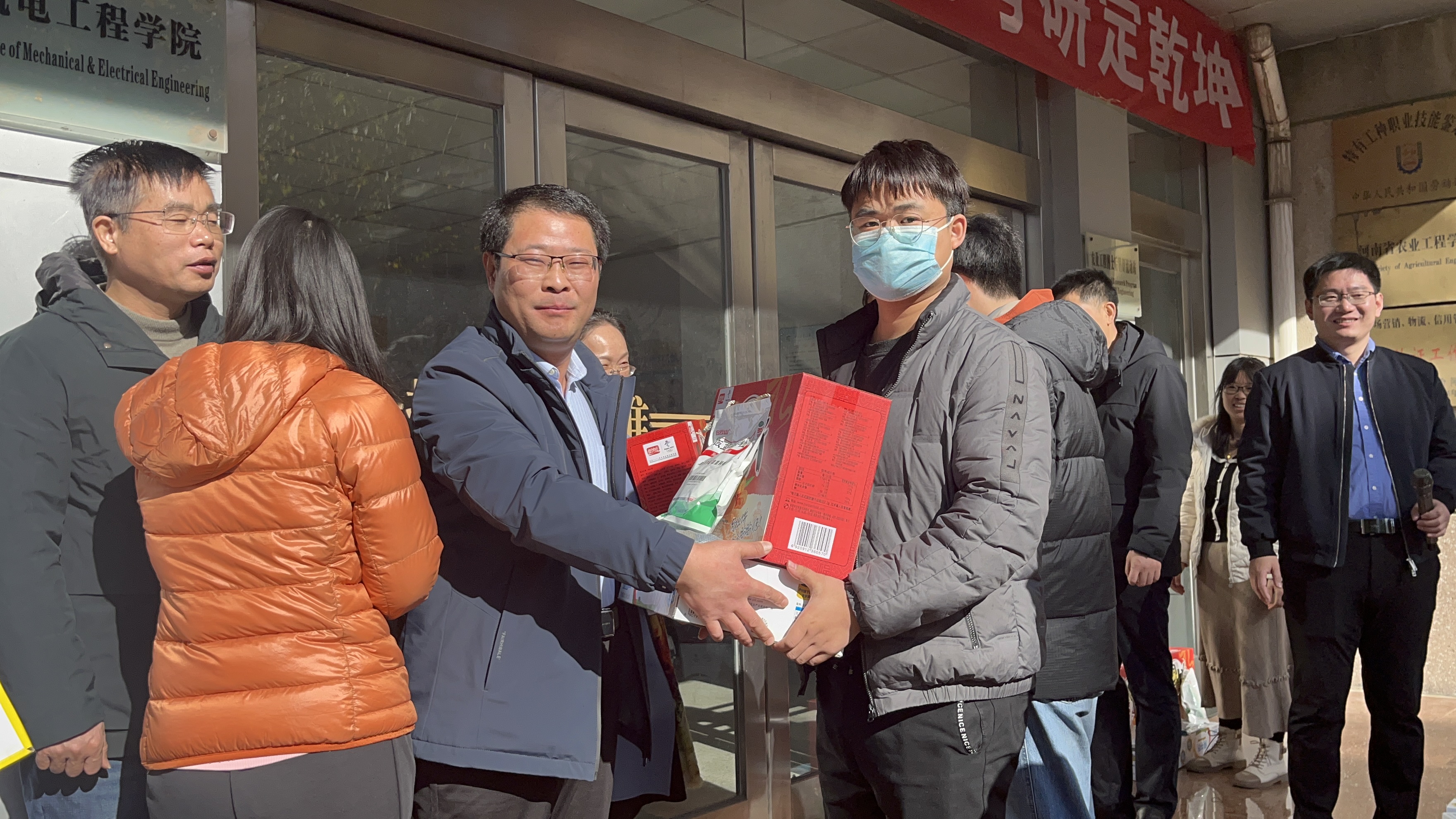 于文化路校区15号楼前开展“机电寒冬送温暖,提笔考研定乾坤”考研送温暖活动。学院领导班子、毕业班年级辅导员及各专业辅导员奔赴现场为考研学子发放爱心物品,91猫先生