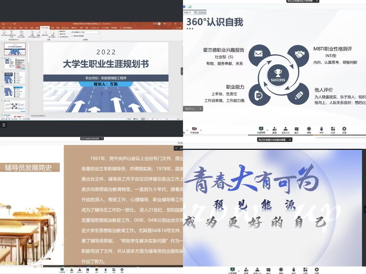 高度重视此次大赛的组织与开展,前期进行了广泛的宣传工作,线上在各个学生班发布相关文件进行通知宣传,线下召开班长支书会议动员学生踊跃参加,在全院内营造积极良好的比赛氛围。本次大赛以“逐梦青春•职击未来”为主题,经过前期的精心筹备与层层选拔,本次大赛共有26项作品脱颖而出,进入决赛。参赛选手按照抽签顺序依次进行参赛展示。比赛过程紧张有序,选手们以PPT为载体,结合个人实际情况,分别从自我认知、职业决策、计划与路径、评估与调整等方面进行展示,绘制出未来的美好蓝图。