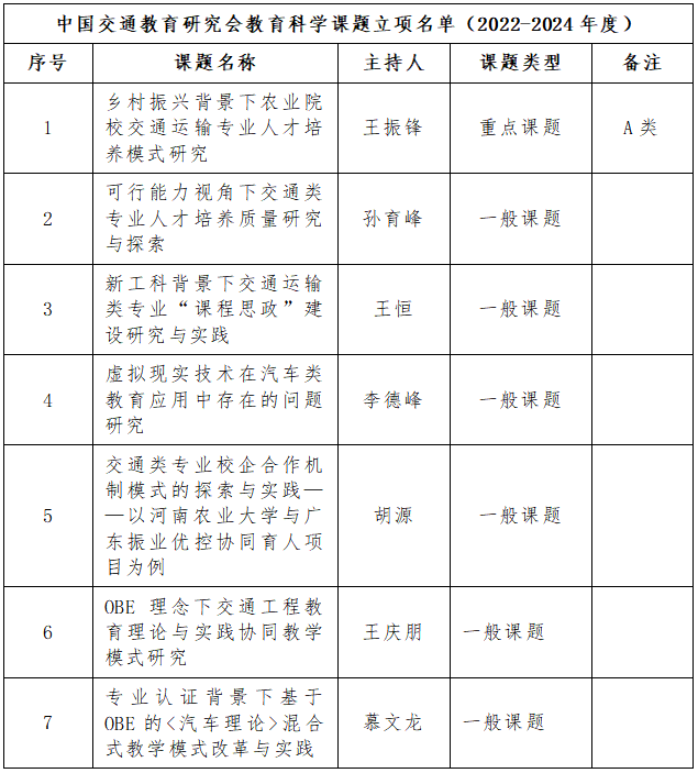 中国交通教育研究会2022-2024年度教育科学研究课题由中国交通教育研究会立项评选,服务于新时代“交通强国”和“教育强国”建设,积极推动中国交通教育高质量创新发展。
