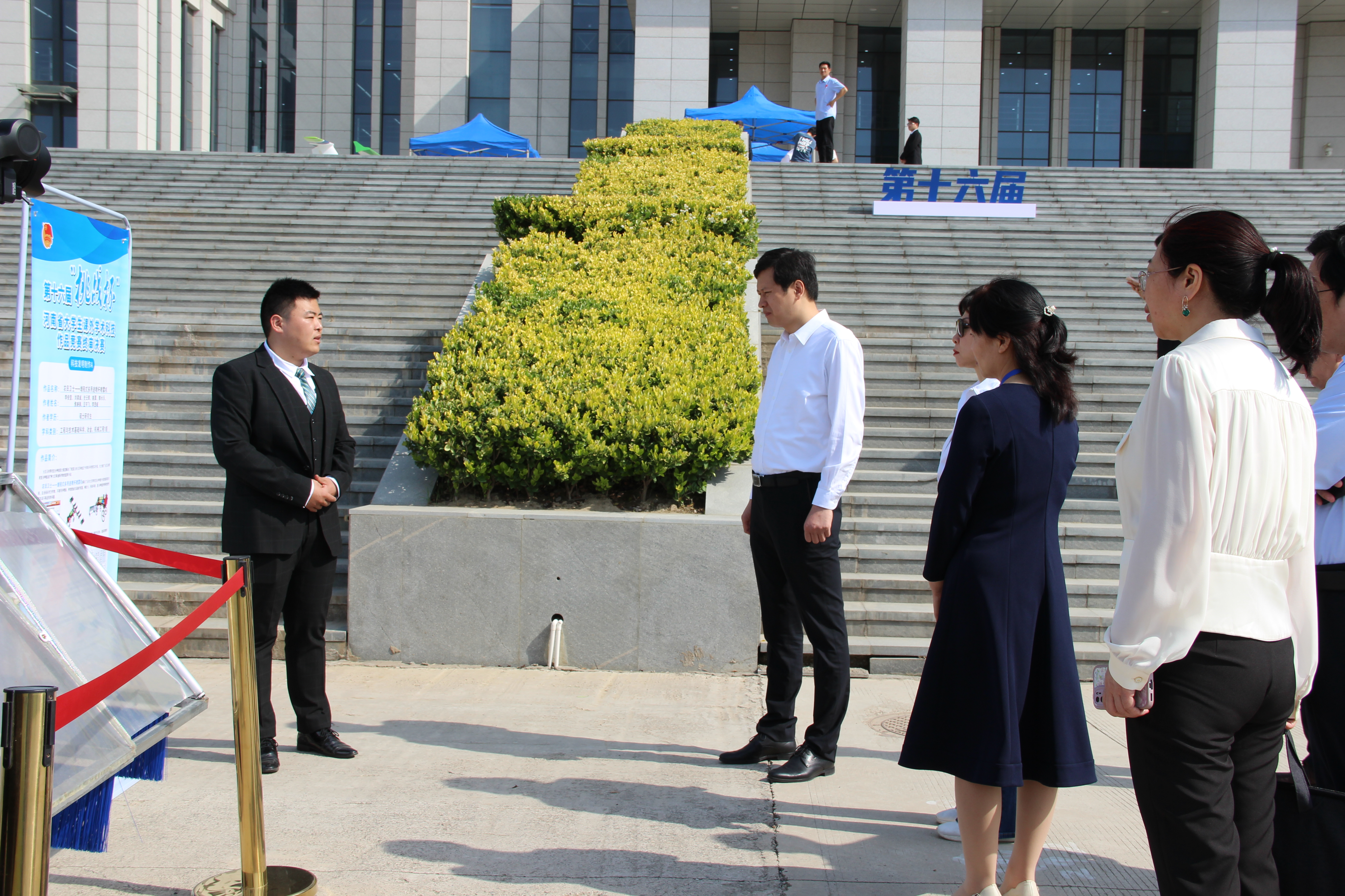 共青团河南省委书记王笃波、校党委副书记游舸和校团委负责人分别亲临作品展现场观摩指导,他们听取了参赛选手对作品的介绍,鼓励同学们继续关注前沿科技与创新,提升社会服务价值。