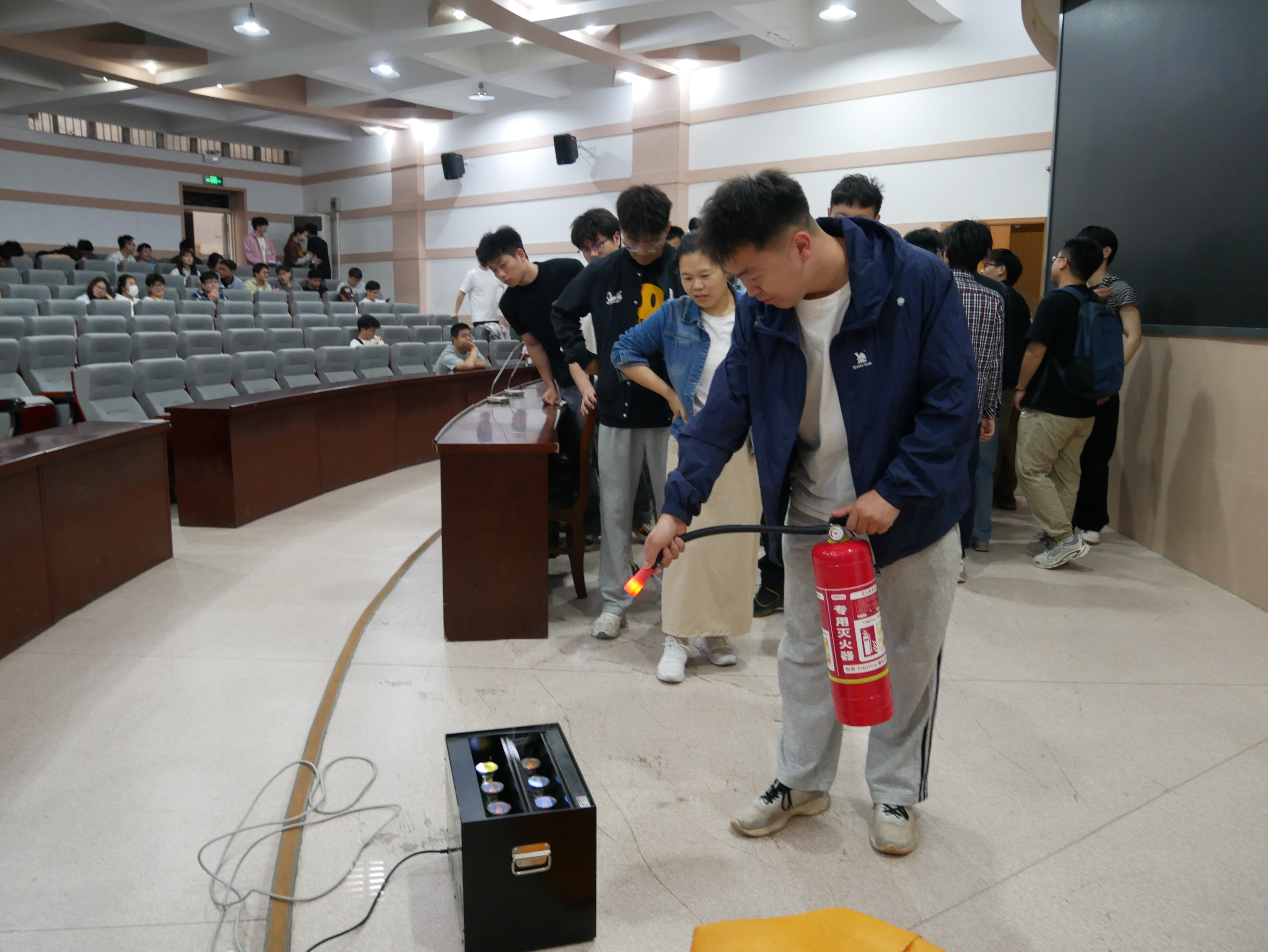 在文化路校区300人报告厅组织消防演练培训活动。研究生全体成员及全体教职工积极参与,共同学习灭火器及灭火毯等消防器具的使用方法,提升消防应急技能。