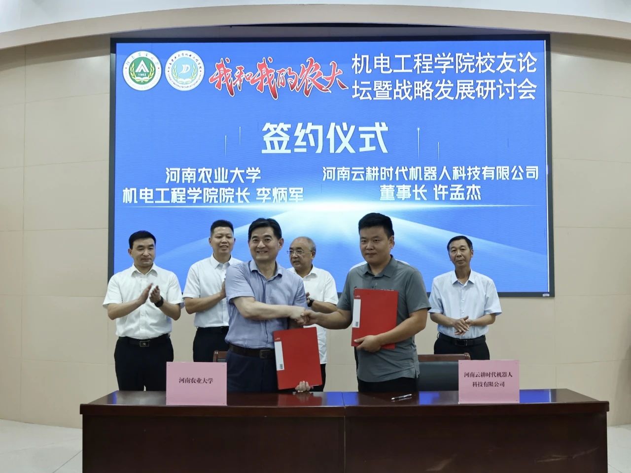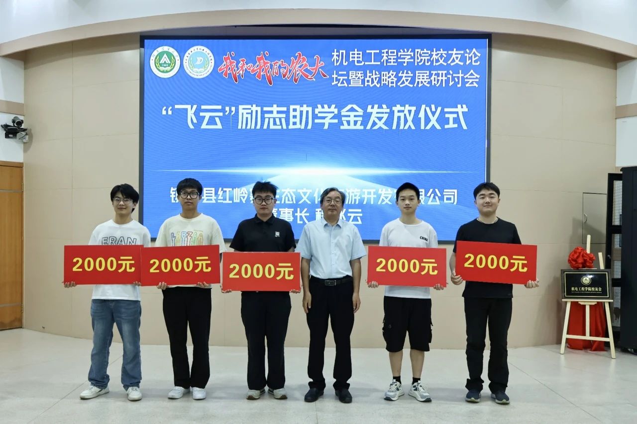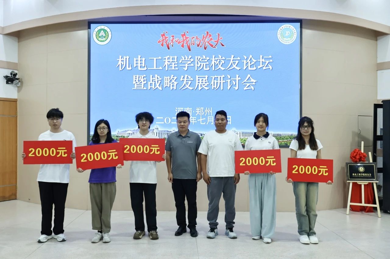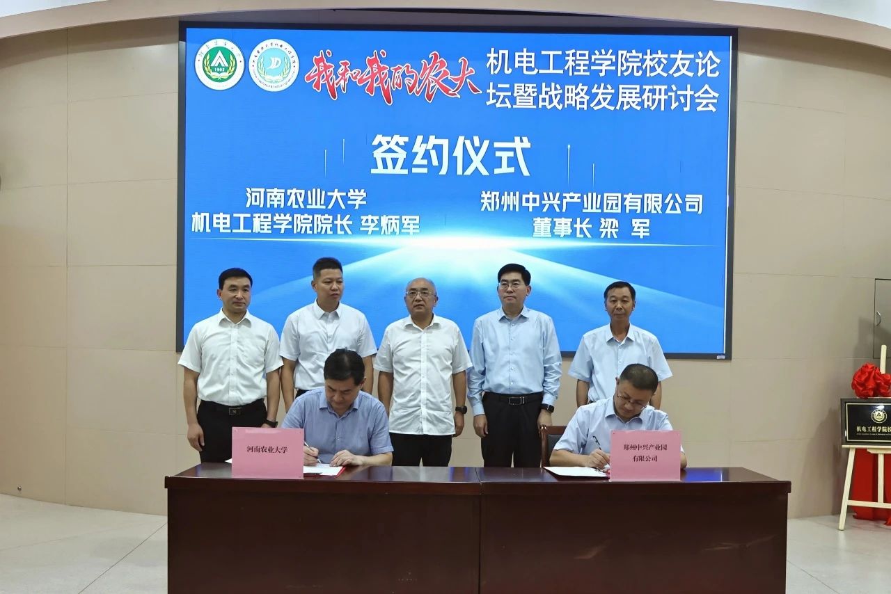 与郑州中兴产业园有限公司、河南云耕时代机器人科技有限公司签订共建教学实习基地协议。镇平县红岭寨生态文化旅游开发有限公司董事长程飞云为学生代表发放“飞云”励志助学金,河南云耕时代机器人科技有限公司负责人冉云亮、许孟杰为学生代表发放“汇智·云耕杯奖学金”。