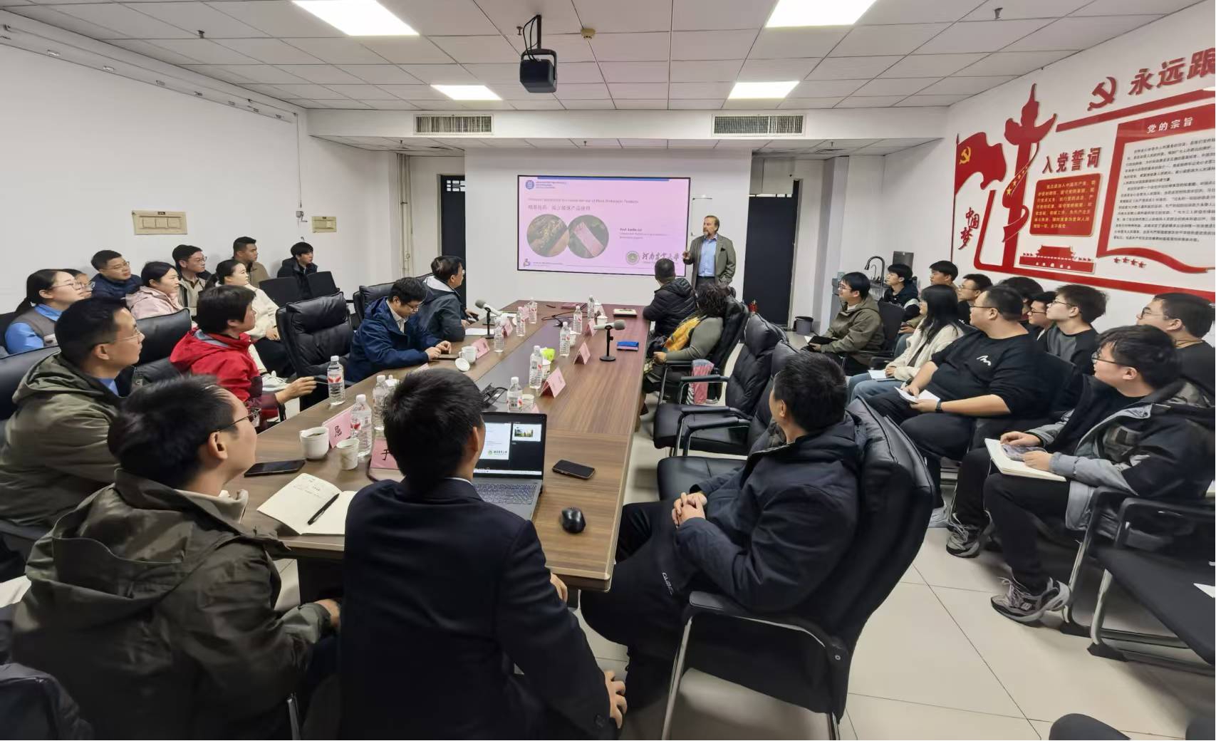 EMILIO GIL教授为团队教师及研究生作题为“PRECISION APPLICATION TO REDUCE THE USE OF PLANT PROTECTION PRODUCTS”的学术报告,由副院长胡建东教授主持。EMILIO GIL教授结合自身科研经历就国外大田及果园环境下精准施药关键技术及装备进行了详细分享。报告会结束后,团队老师们和EMILIO GIL教授进行了热烈的讨论,在植保减量施药、机器学习应用场景、性能测试及效果评价等方面进行了深入交流。