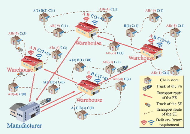 针对连锁企业商品运输中的各类复杂物流作业场景,本研究构建了 “多品类商品同时取送货的两级车辆路径问题”模型。该模型突破了以往研究仅在单一运输层级考虑同时取送货的局限,实现了两级运输网络中取货与送货的协同优化;同时引入基于产品批次的配送优先级机制,允许车辆在运输途中动态调整货物装载方案,支持商品跨节点灵活再分配,能够显著减少库存浪费、降低整体运输成本。