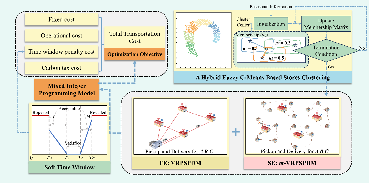 针对该模型求解复杂度高、适配数据规模大的特点,研究团队创新提出一种混合启发式算法:先通过混合模糊 C 均值聚类对门店与仓库进行智能分配,有效缩小模型求解空间;再设计改进的多种群遗传算法,结合变邻域搜索策略,实现对子问题的高效求解。该算法还创新性引入模拟退火机制优化适应度计算,同时设计自适应交叉变异与短路径消除策略,进一步提升求解结果的质量与稳定性。研究结果显示,相较于传统取送货分开操作的模式,同时取送货模式平均减少车辆调度次数 39.62%,总运输成本降低 34.66%;在支持商品灵活再分配的情况下,运输成本仅微增 0.47%,需调配商品的运输量却减少 28.72 吨。本研究提出的算法在求解质量与运行效率上均优于其他同类算法,展现出极佳的工程应用价值。