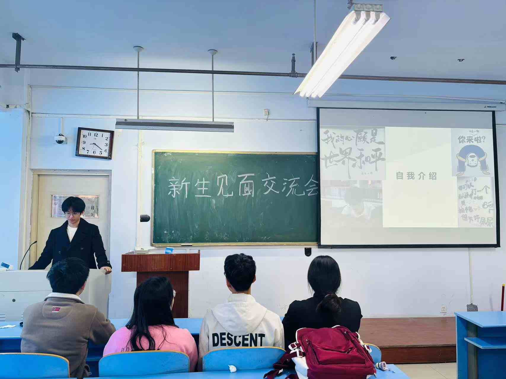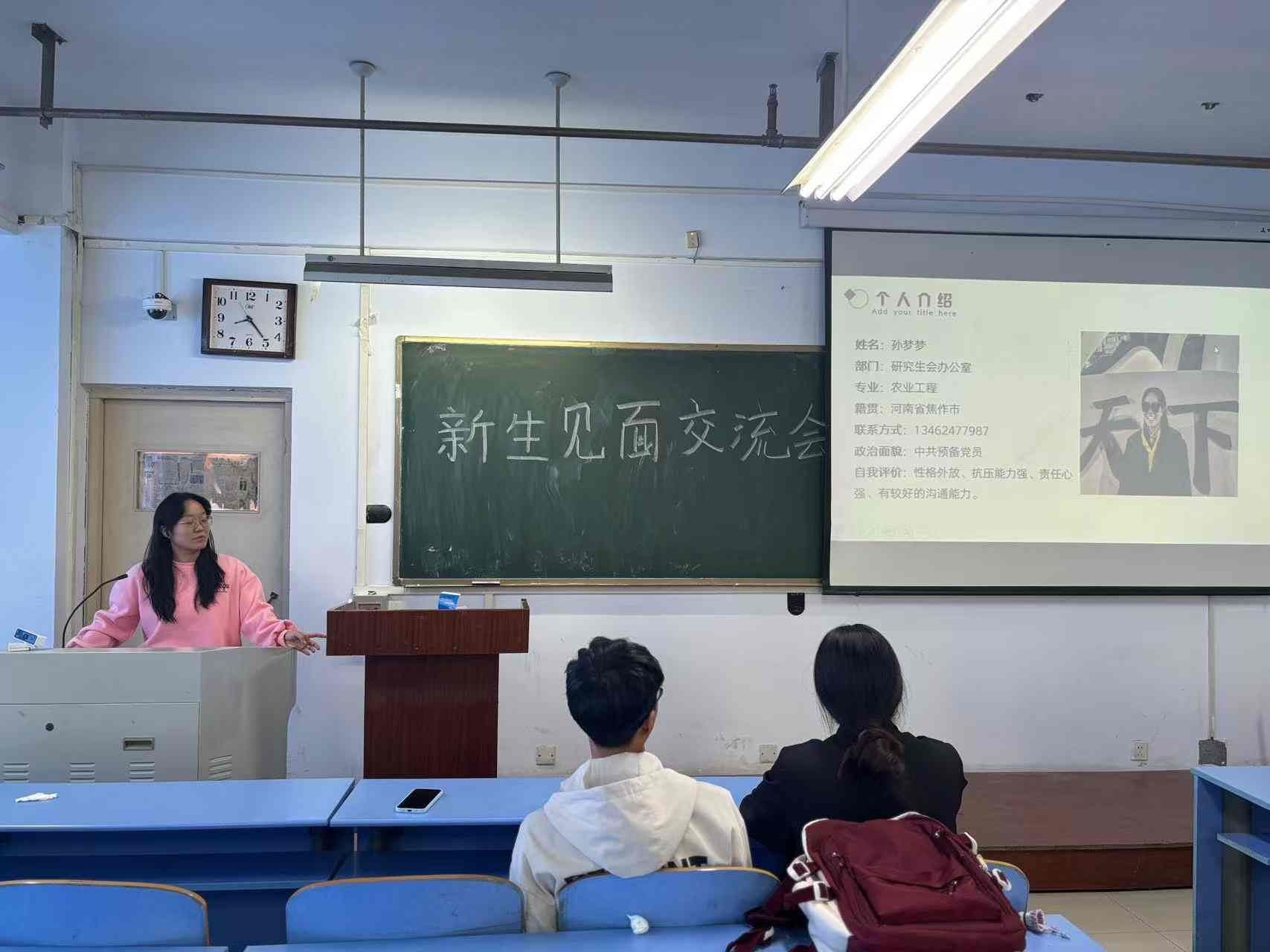 随后同学们依次上台,从个人基本情况,学习科研方向,个人兴趣爱好与特长等几方面分别进行自我介绍。