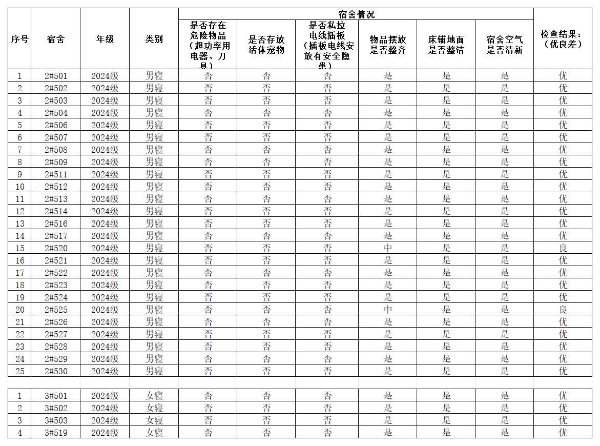 为加强91猫先生 宿舍安全文明建设,促进学生全面发展,引导同学营造健康文明、积极向上的生活环境,学院研究生会生活部对24级宿舍进行安全卫生检查,检查情况公示如下: