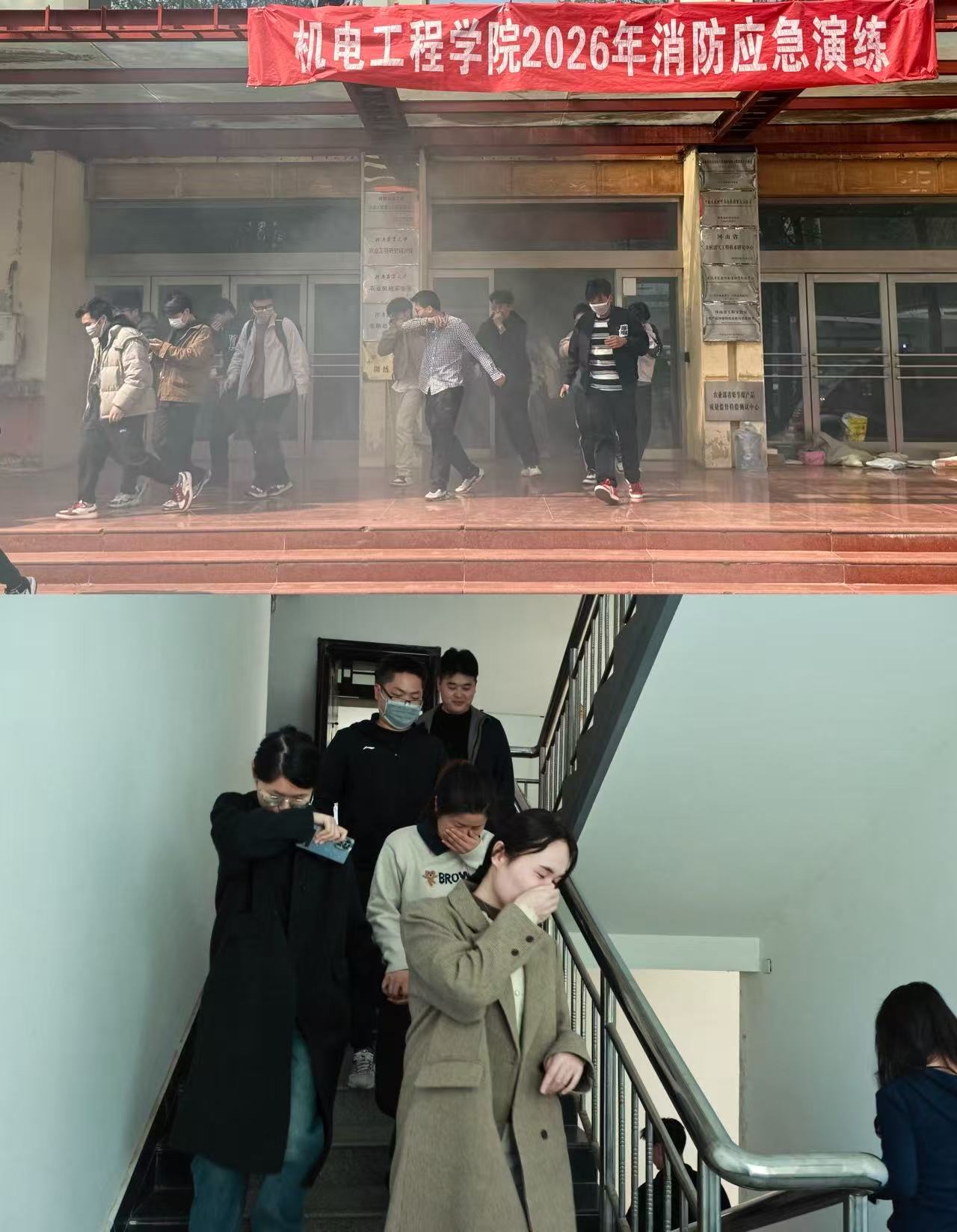 演练警报响起后,楼内模拟浓烟环境,同学们迅速按照逃生要领弯腰捂鼻,沿安全通道有序撤离至指定地点,疏散过程紧张有序。随后工作人员现场教学灭火器 “提、拔、握、压” 使用方法,并组织学生实操练习,同时讲解实验室火灾隐患排查要点。