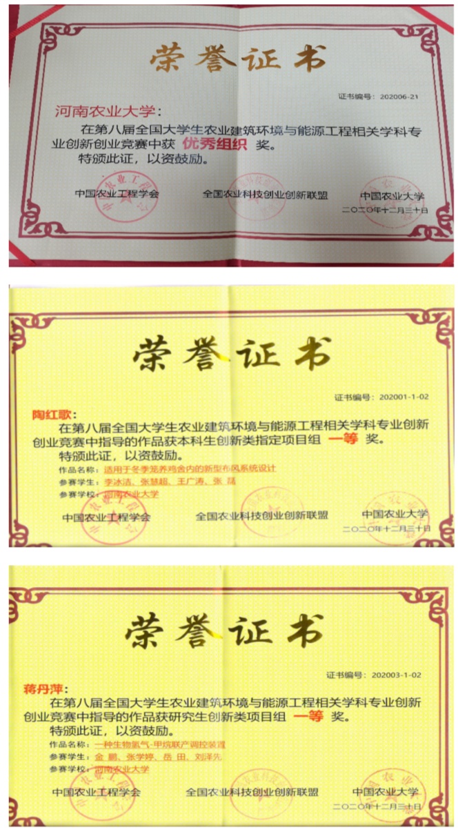 派出的5支代表队发挥出色,蒋丹萍老师指导的作品“一种生物氢气-甲烷联产调控装置”和陶红歌老师指导的作品“适用于冬季笼养鸡舍内的新型补风系统设计”荣获一等奖,刘亮老师指导的作品“一种利用热管和相变技术的太阳能沼气发酵加热系统”荣获二等奖,潘晓慧老师指导的作品“半自动化鸡舍绒毛处理装置”和马晓然老师指导的作品“一种基于种养一体化立体循环系统的节能环保猪舍”荣获三等奖,我校获大赛优秀组织奖。