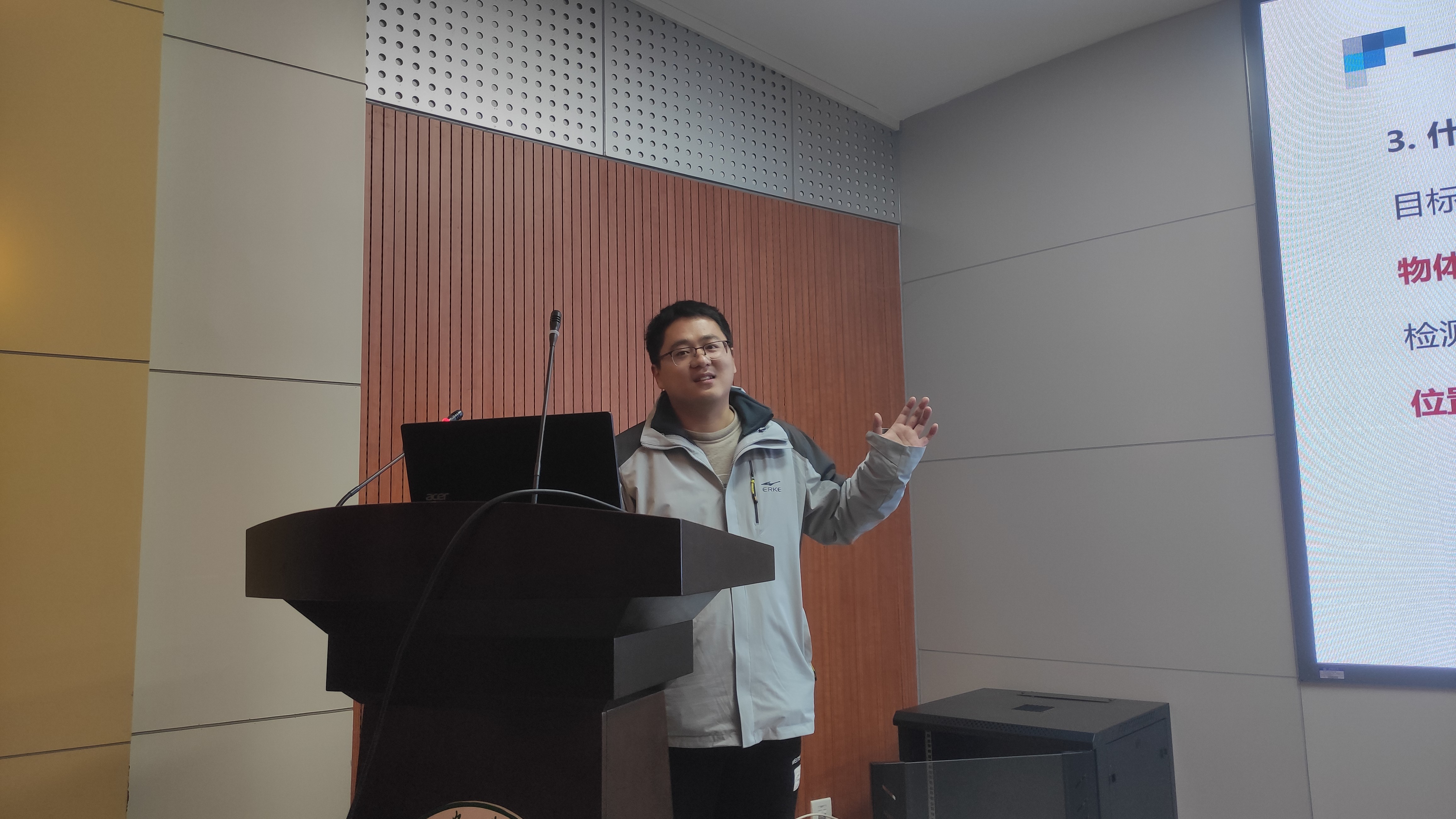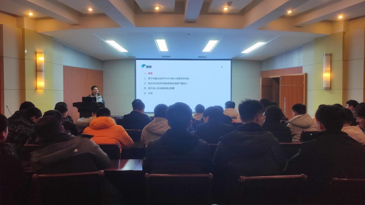 讲座中,杨自尚以“基于目标检测的果实视频产量估计方法研究”为题给同学们做报告。首先,杨自尚为同学们引出目标检测这一技术并举例说明了此技术在农业中的应用,接下来杨自尚通过对国内外目标检测技术发展现状对比引导同学们往更深层次了解,然后结合视频与图片向同学们讲解实现目标检测技术所用的具体方法,最后杨自尚通过分析现实因素向同学们介绍了经过逐步优化之后实现目标检测技术的最终方法并且给同学们推荐了学习编程、机器学习以及深度学习的渠道。
