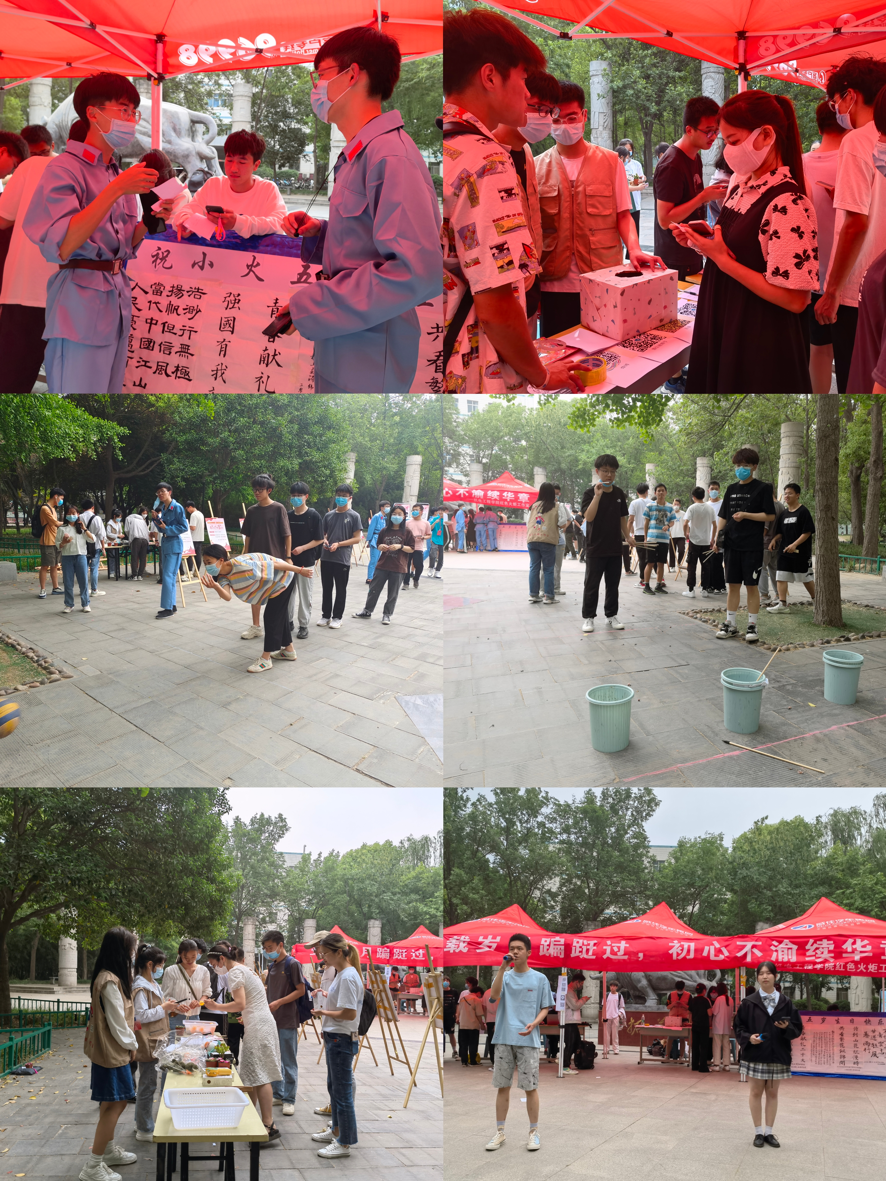 活动现场,不仅有着蕴含丰厚红色文化底蕴的KT展板,还有各种丰富且有趣的小游戏。神秘刺激的纸箱抽奖、奇妙有趣的你画我猜、挑战思维的正话反说、热闹非凡的JD保龄球、挑战十足的趣味投壶……现场同学聚精会神、各显神通,或精准投壶、或生动比划、或用力抛掷,不仅玩得不亦乐乎,更心满意足地获得了各类精美的小礼品。最后,同学们通过演唱红色歌曲,歌颂自己一心向党的浓浓中国情和爱国心。