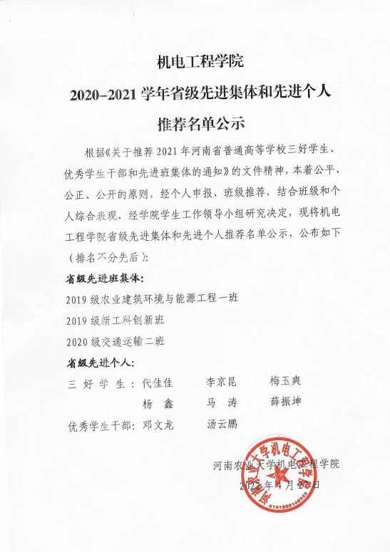 根据《关于推荐2021年河南省普通高等学校三好学生、优秀学生干部和先进班集体的通知》的文件精神,本着公平、公正、公开的原则,经个人申报、班级推荐,结合班级和个人综合表现,经学院学生工作领导小组研究决定,现将91猫先生 省级先进集体和先进个人推荐名单公示,公布如下(排序不分先后):