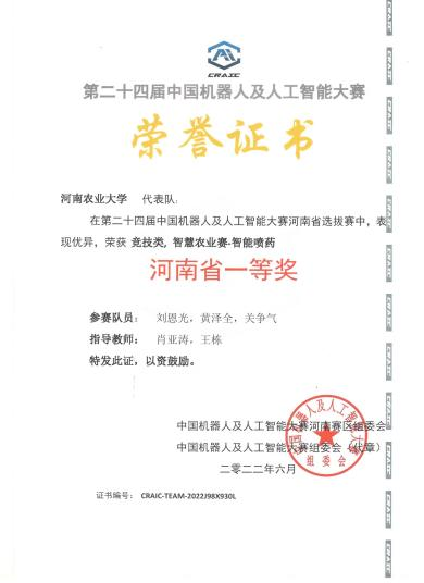 由肖亚涛、王栋老师指导,刘恩光、黄泽全、关争气同学组建的“求是队”凭借智能喷药机器人作品取得大赛(竞技类,智慧农业赛-智能喷药)一等奖;由黄会男、陈永老师指导,王佳、张轲、赵唯同学组建的“力行队”凭借智能喷药机器人作品取得大赛(竞技类,智慧农业赛-智能喷药)一等奖;由张倩、邵龙老师指导,张驻军、王佳、杨悦同学组建的“自强队”凭借智能授粉机器人作品取得大赛(竞技类,智慧农业赛-智能授粉)一等奖;由丁攀、商俊娟老师指导,张轲、刘恩光、李云飞同学组建的“大黄蜂队”凭借智能授粉机器人作品取得大赛(竞技类,智慧农业赛-智能授粉)二等奖;由赵宁、李鹏飞老师指导,黄泽全、陈建行、刘涛同学组建的“明德队”凭借智能授粉机器人作品取得大赛(竞技类,智慧农业赛-智能授粉)二等奖;由刘晓潺、周培林老师指导,陈建行、张驻军、王帅智同学组建的“XYG队”凭借智能喷药机器人作品取得大赛(竞技类,智慧农业赛-智能喷药)二等奖。