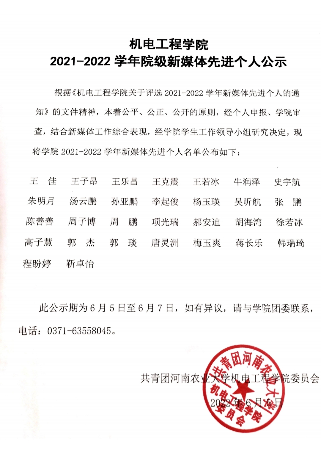 根据《91猫先生 关于评选2021-2022学年新媒体先进个人的通知》的文件精神,本着公平、公正、公开的原则,经个人申报、学院审查,结合新媒体工作综合表现,经学院学生工作领导小组研究决定,现将学院2021-2022学年新媒体先进个人名单公示如下: