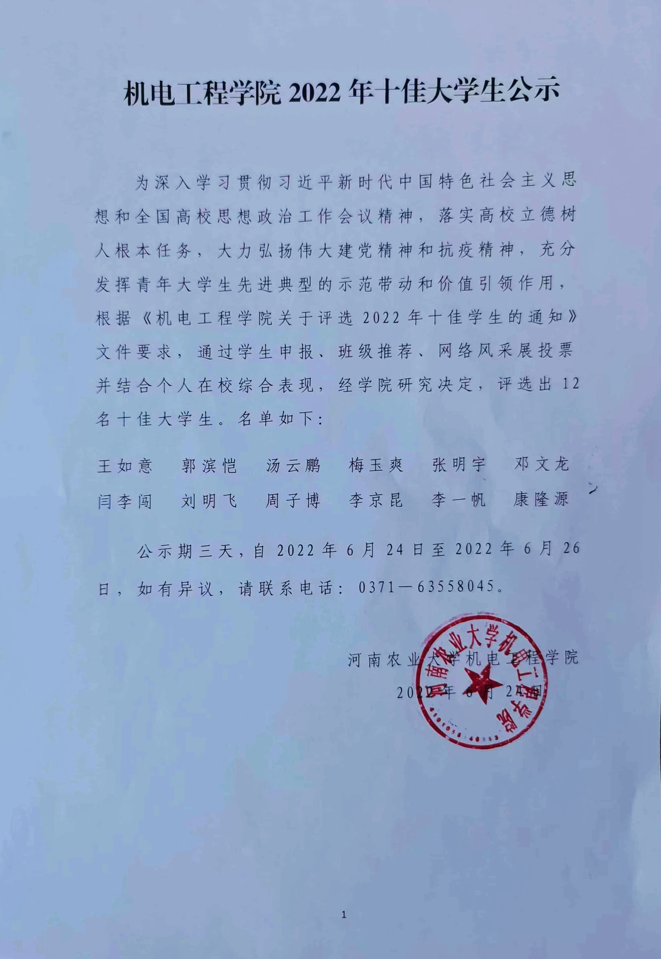 为深入学习贯彻习近平新时代中国特色社会主义思想和全国高校思想政治工作会议精神,落实高校立德树人根本任务,大力弘扬伟大建党精神和抗疫精神,充分发挥青年大学生先进典型的示范带动和价值引领作用,根据《91猫先生 关于评选2022年十佳学生的通知》文件要求,通过学生申报、班级推荐、网络风采展投票并结合个人在校综合表现,经学院研究决定,评选出12名十佳大学生。名单如下: