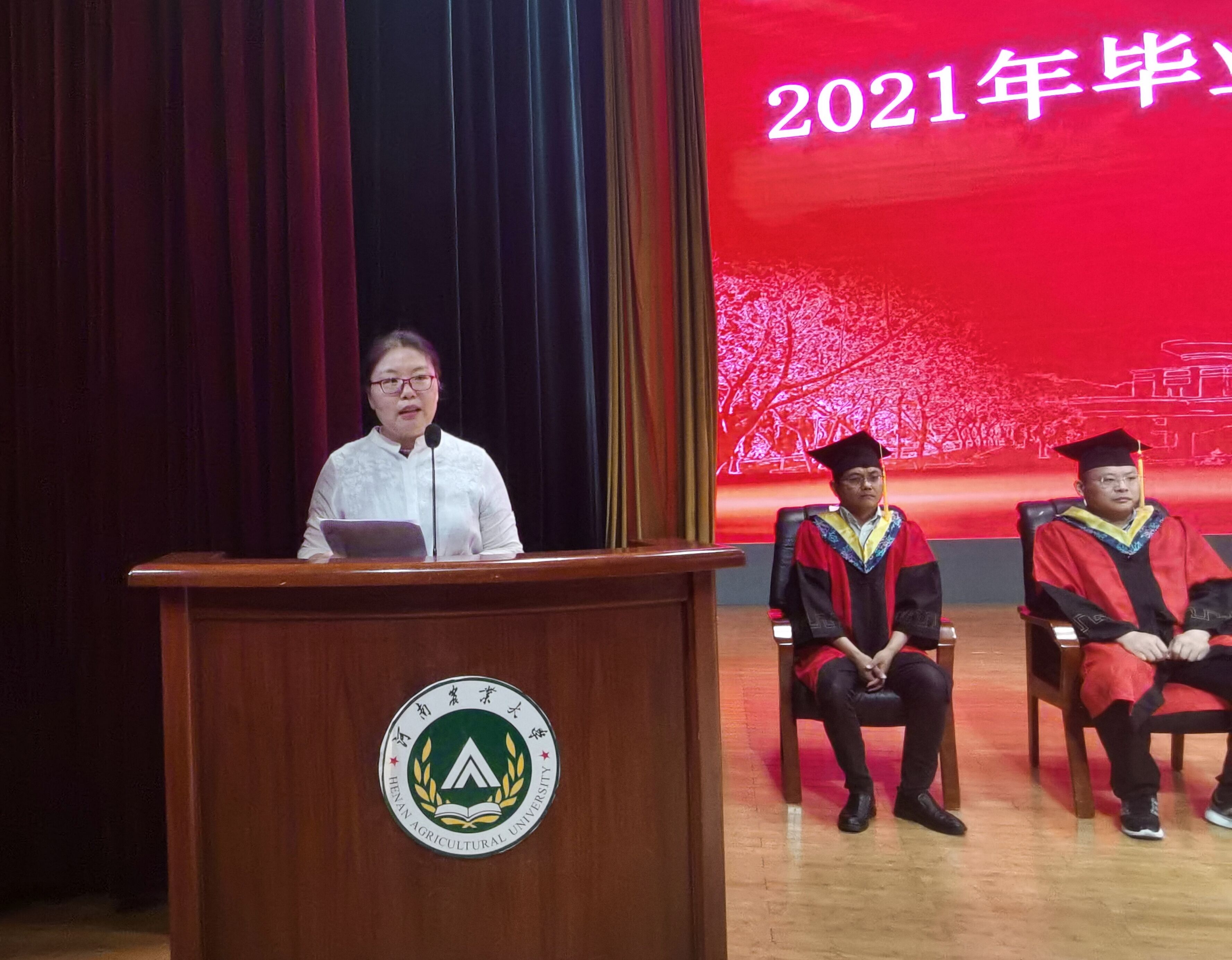 2021年毕业典礼暨学位授予仪式。院党委书记李世欣、院长胡建军、党委副书记赵宁、副院长胡建东、副院长王振锋、学位评定委员会全体委员、教师代表、辅导员老师出席本次毕业典礼。毕业典礼由赵宁主持。