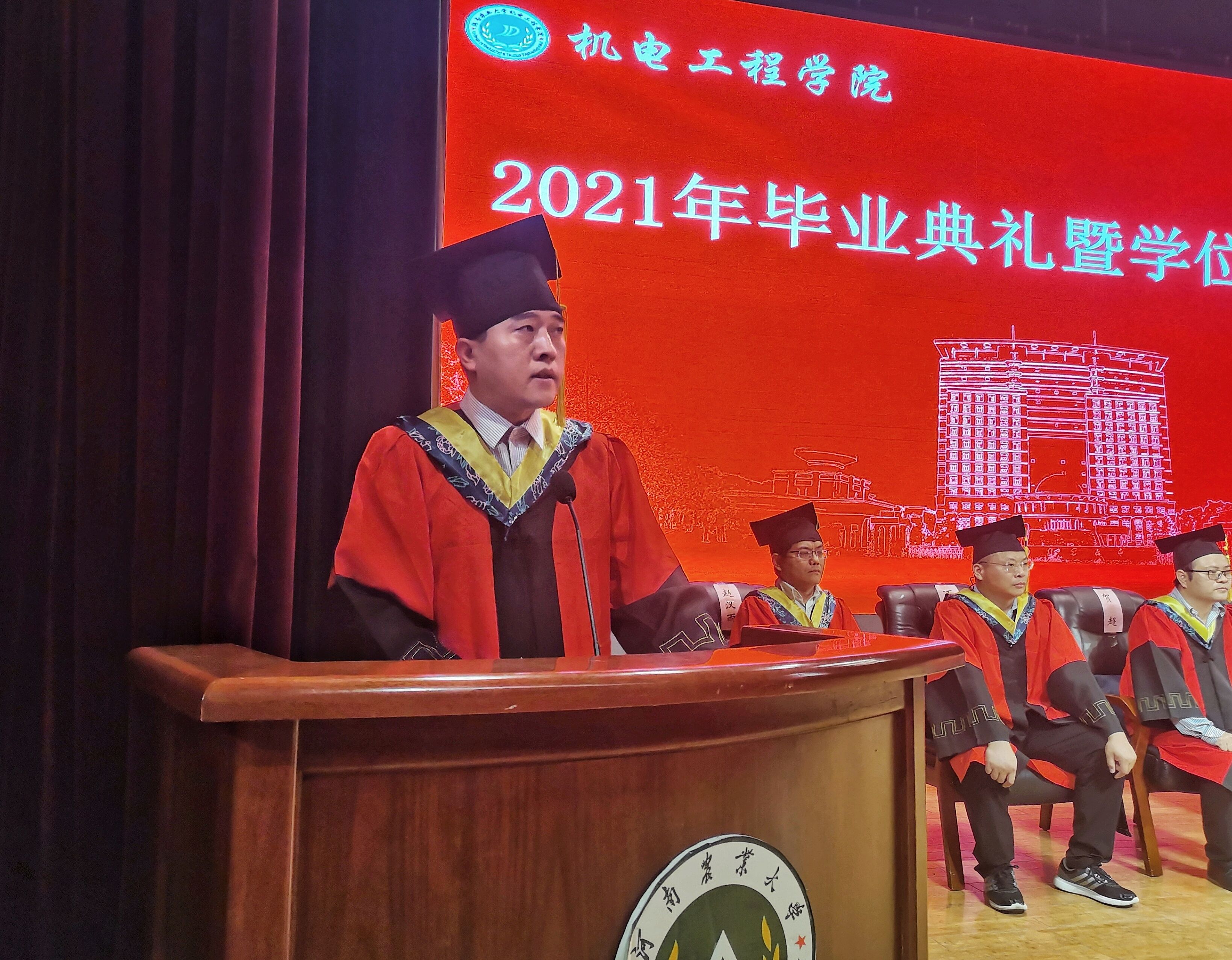 胡建军为全体毕业生讲话,他首先表达对2020届、2021届毕业生们成长成才的欣慰与自豪,对学院以及同学们四年来取得的成就作出肯定,并对全体师生表示感谢,他指出,学院成就的取得与全体师生的共同努力有不可分割的联系。其次,他勉励毕业生们在日后的人生路途中要牢牢记住三个“问题”:一、我是谁,同学们要准确知道“我是谁”,才能让自己的人生事业走向辉煌;二、到哪去,希望大家能把人生追求、社会发展、人生需要三者进行有机结合,用奋斗的精神激扬青春的美丽;三、怎么去,希望大家牢记“坚定、坚信、坚持”,坚定信念、坚守初心,坚持走下去。最后,他向毕业生们表达期望,希望同学们牢记“团结一致,奋力拼搏”的精神,敢于以天下为己任,创造属于自己的人生辉煌。