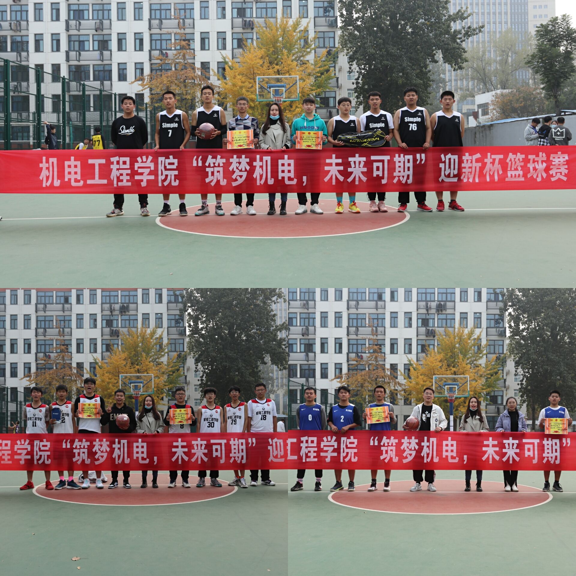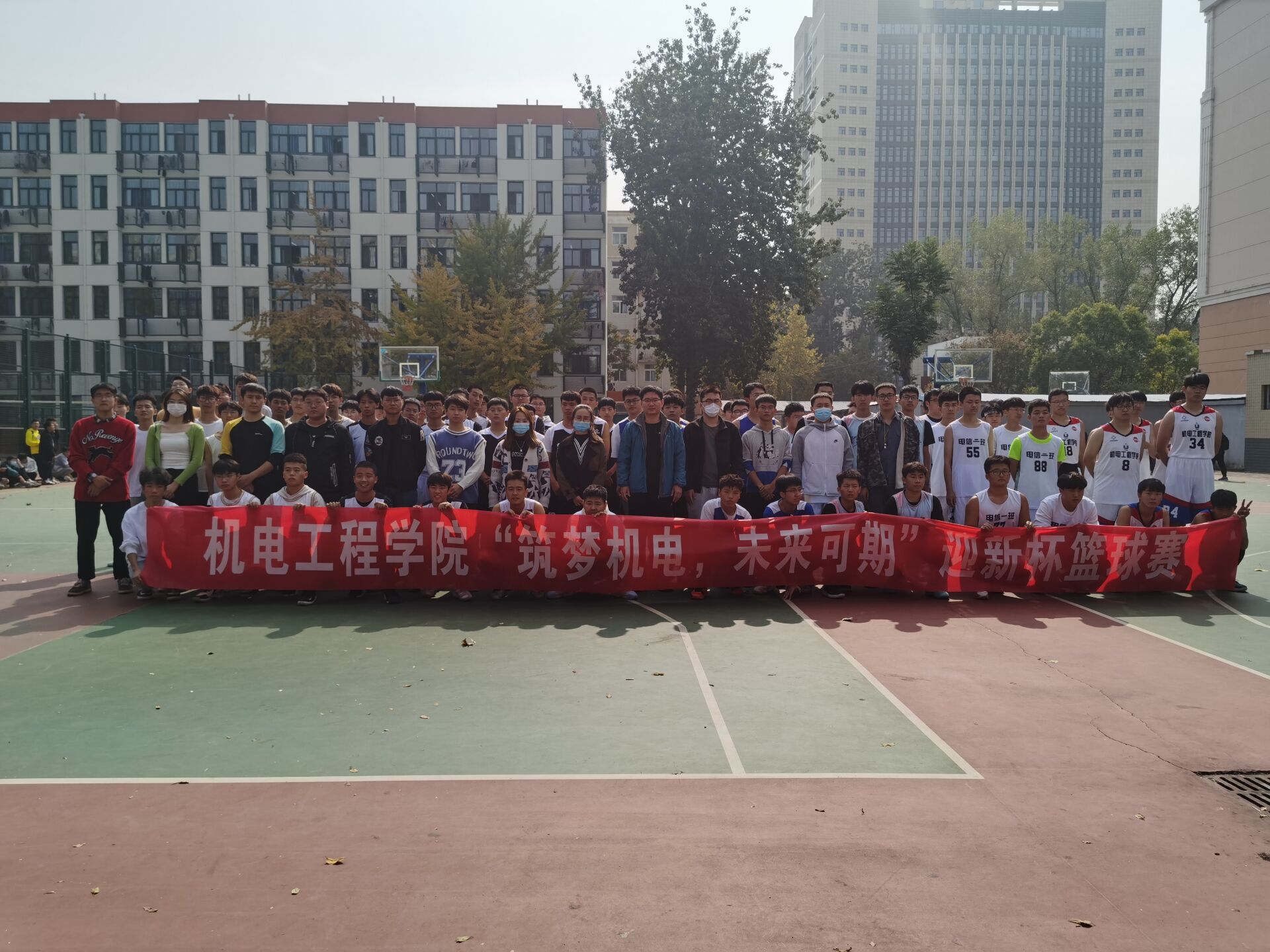 于文化路校区篮球场举办“筑梦机电,未来可期”迎新杯篮球赛,期间,院团委书记黄笑、新生年级辅导员王晓楠到场观赛,为学生助威加油。本次篮球赛由院学生会体育部负责组织和裁判。