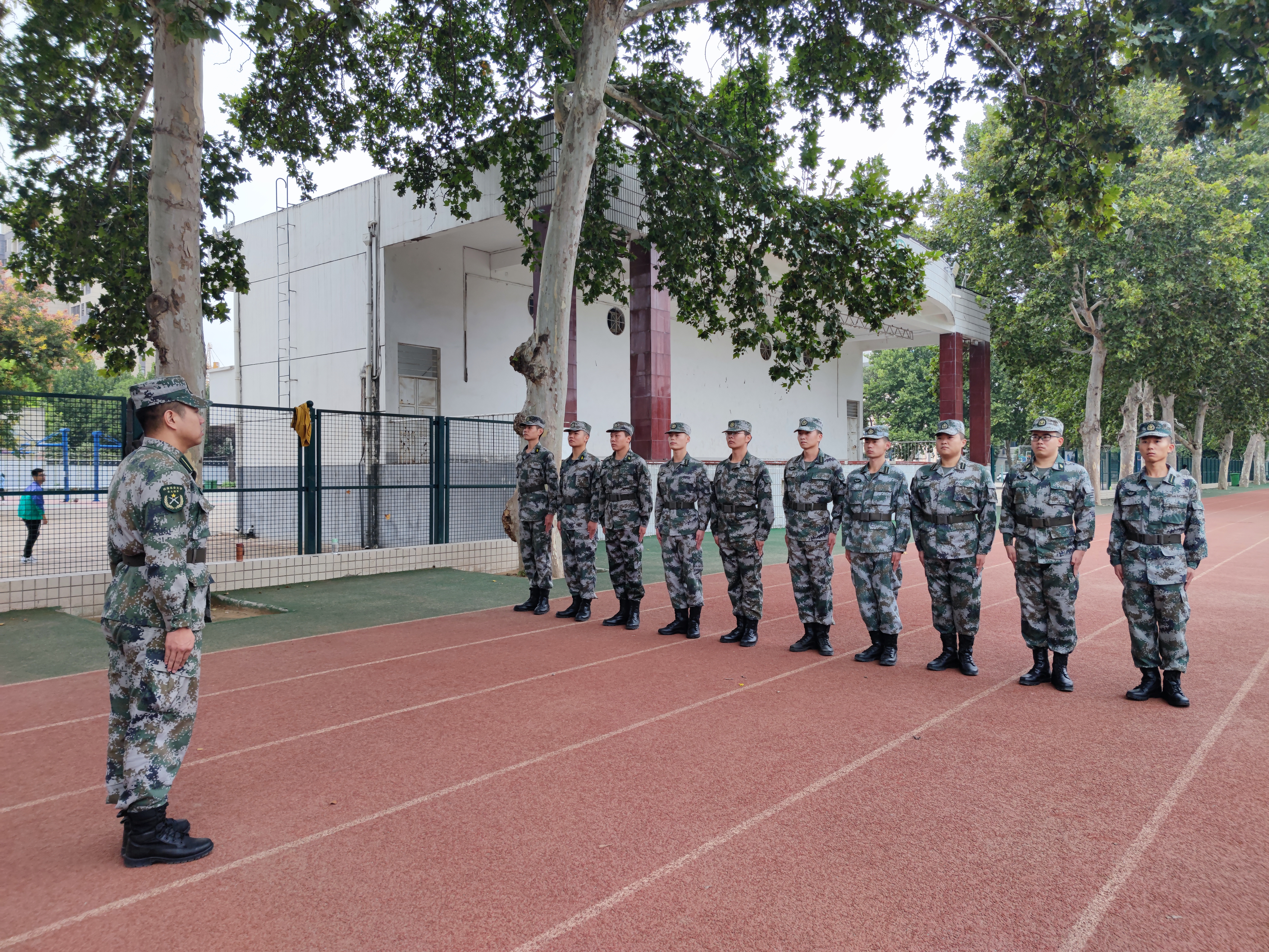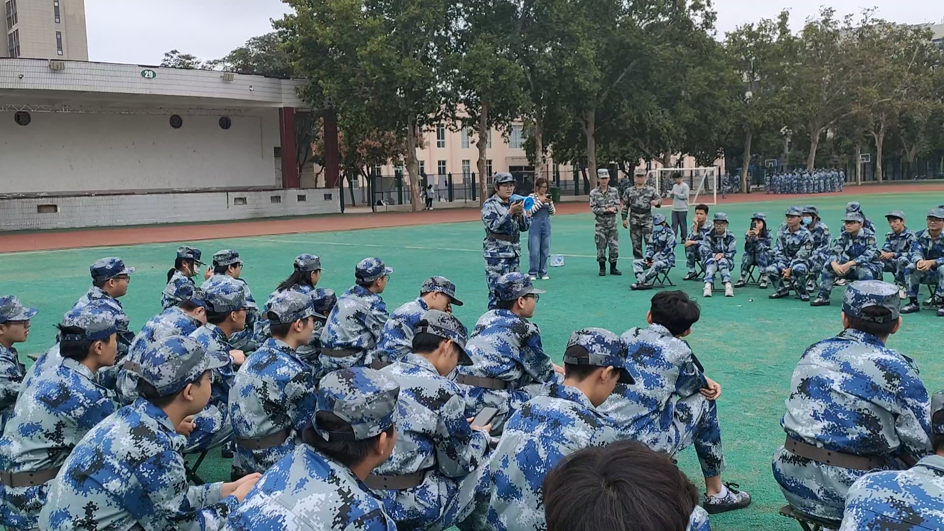 于文化路校区操场举办2022级新生国防教育素质教育活动。全体2022级新生参加活动,指导员对其进行指挥训练。
