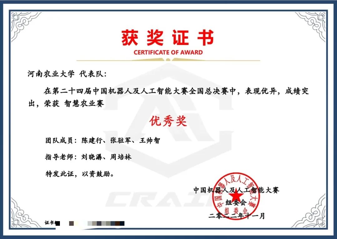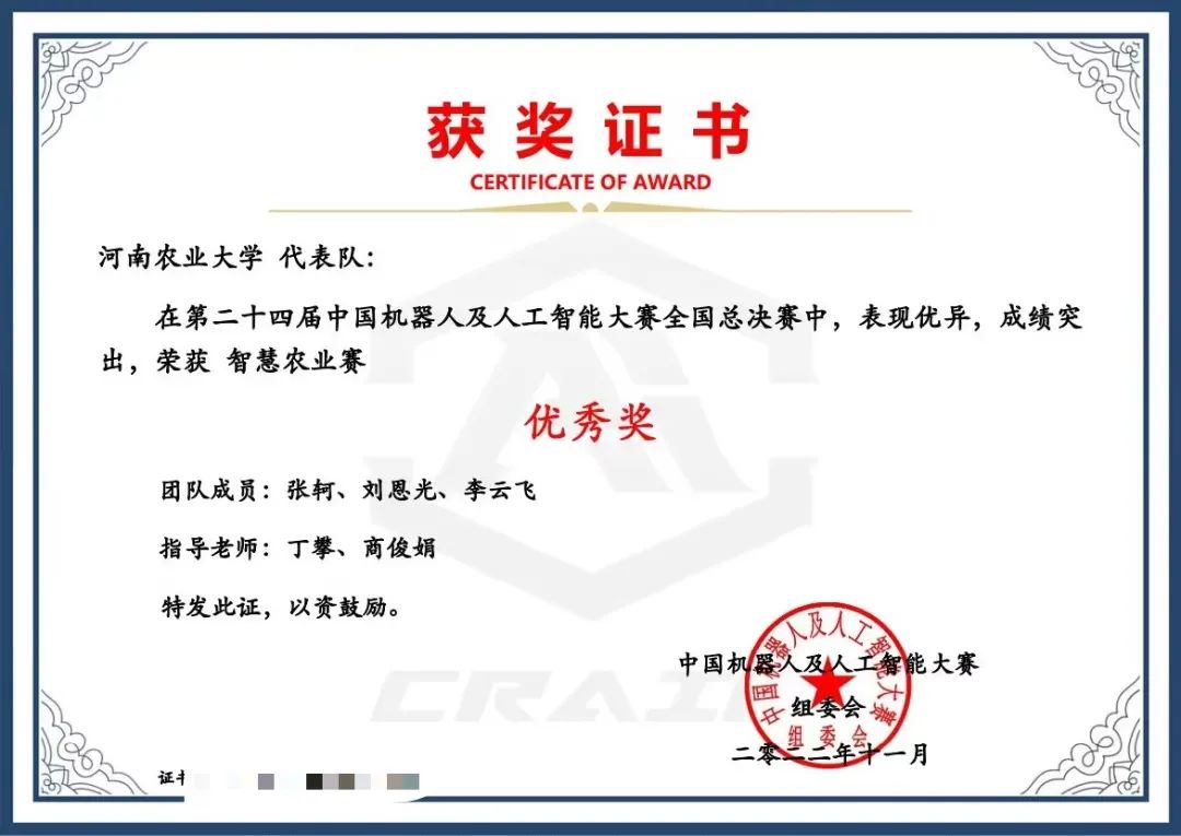 由赵宁、李鹏飞老师指导,黄泽全、陈建行、刘涛同学组建的团队取得智慧农业赛一等奖;由黄会男、陈永老师指导,王佳、赵唯、张轲同学组建的团队取得智慧农业赛一等奖;由张倩、邵龙老师指导,张驻军、王佳、杨悦同学组建的团队取得智慧农业赛二等奖;由肖亚涛、王栋老师指导,刘恩光、黄泽全、关争气同学组建的团队取得智慧农业赛优秀奖;由刘晓潺、周培林老师指导,陈建行、张驻军、王帅智同学组建的团队取得智慧农业赛优秀奖;由丁攀、商俊娟老师指导,张轲、刘恩光、李云飞同学组建的团队取得智慧农业赛优秀奖。
