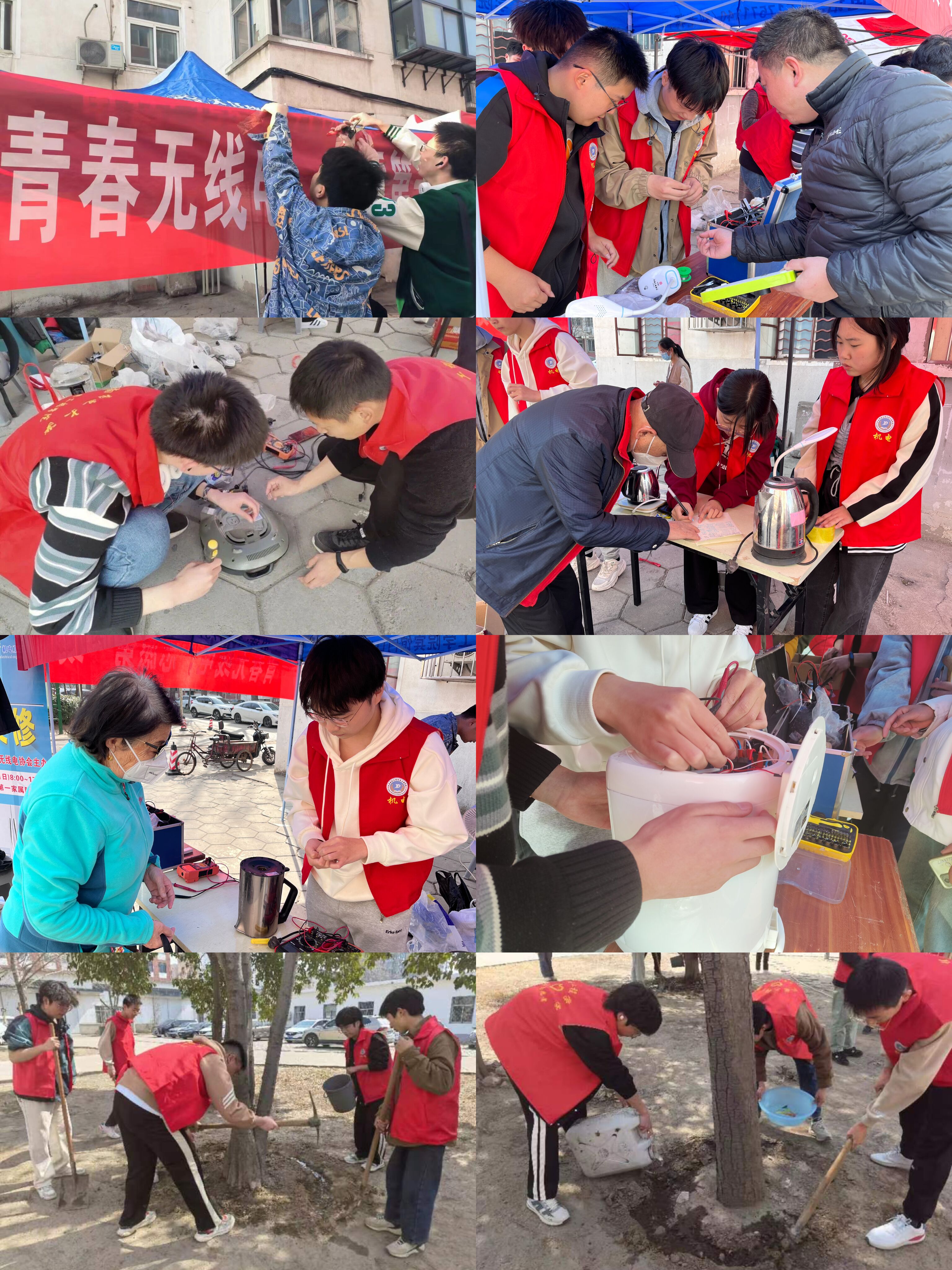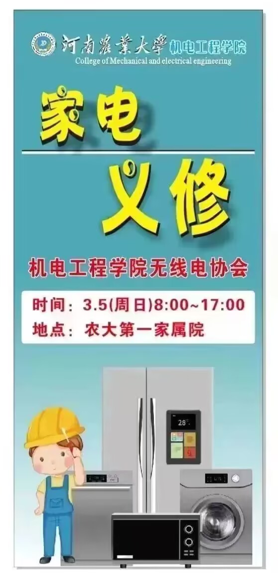 组织大学生志愿者在农大一区家属院和三区实习工厂开展义务家电维修等志愿服务活动。