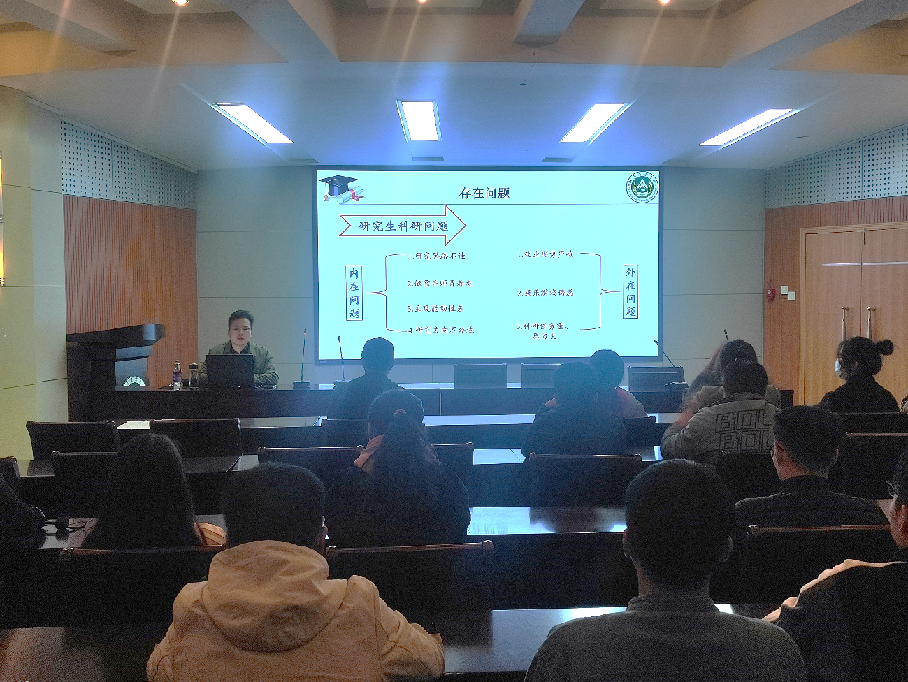 李冬冬以“科研学习经验分享”为题为与会研究生开展学术讲座。讲座伊始,李冬冬先介绍了严峻的考研和就业形势——目前考研人数增多但录取人数并无较大的变化且毕业生面临找工作难的情况,并与学生交流了“作为考研成功上岸的我们,该如何规划科研学习,为毕业求职做准备?”的问题。接下来,李冬冬提出了研究生科研存在的内在和外在问题,如内在问题:研究思路不佳、主观能动性差及外在问题:就业形势严峻、娱乐游戏诱惑、科研压力大等,并与学生探讨了“如何与导师保持良好的师生关系、合作关系?”的问题。然后李冬冬从学习、课程、论文撰写、科研课题四个方面分别介绍了如何制定科研规划,养成良好的科研习惯。之后,李冬冬就读博、企业、考公、创业四种不同的未来发展提出了建议。会议最后,李冬冬向同学们分享了发表的第一篇SCI论文的写作经验,鼓励同学们大量阅读文献,并要注意论文的写作技巧尤其要学习英语文献的写作手法,对以后论文的发表有一定的帮助。