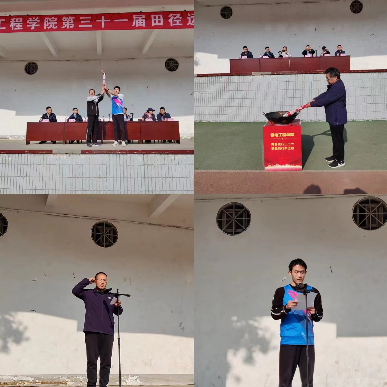 随后,运动员代表李帅、裁判员代表范玉辉依次进行发言、宣誓。院党委书记李世欣点燃开幕火炬,刘圣勇教授、王万章教授、运动员代表参与火炬接力。紧接着,李世欣郑重宣布第三十一届院运会正式开始。