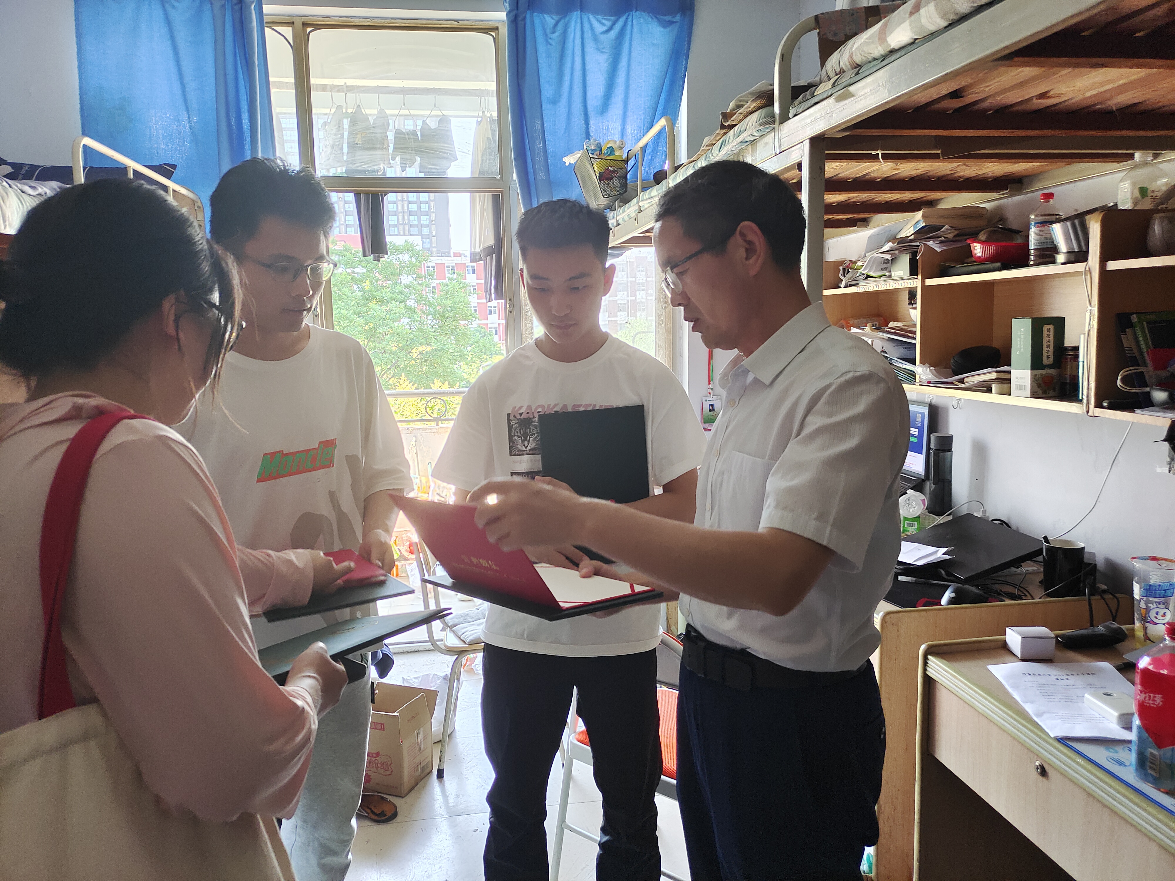 领导老师亲切询问毕业生的考研与就业状况,并依据因人制宜的理念,提出合理的发展建议,鼓励宽慰未就业的学生不要有心理压力,放下思想包袱,把握好每次到来的机遇。李世欣贴心叮嘱同学们外出时注意关好门窗,注重人身和财产安全,提高安全防范意识,并希望同学们能够稳定自身情绪,平安度过在校的最后一段时光。