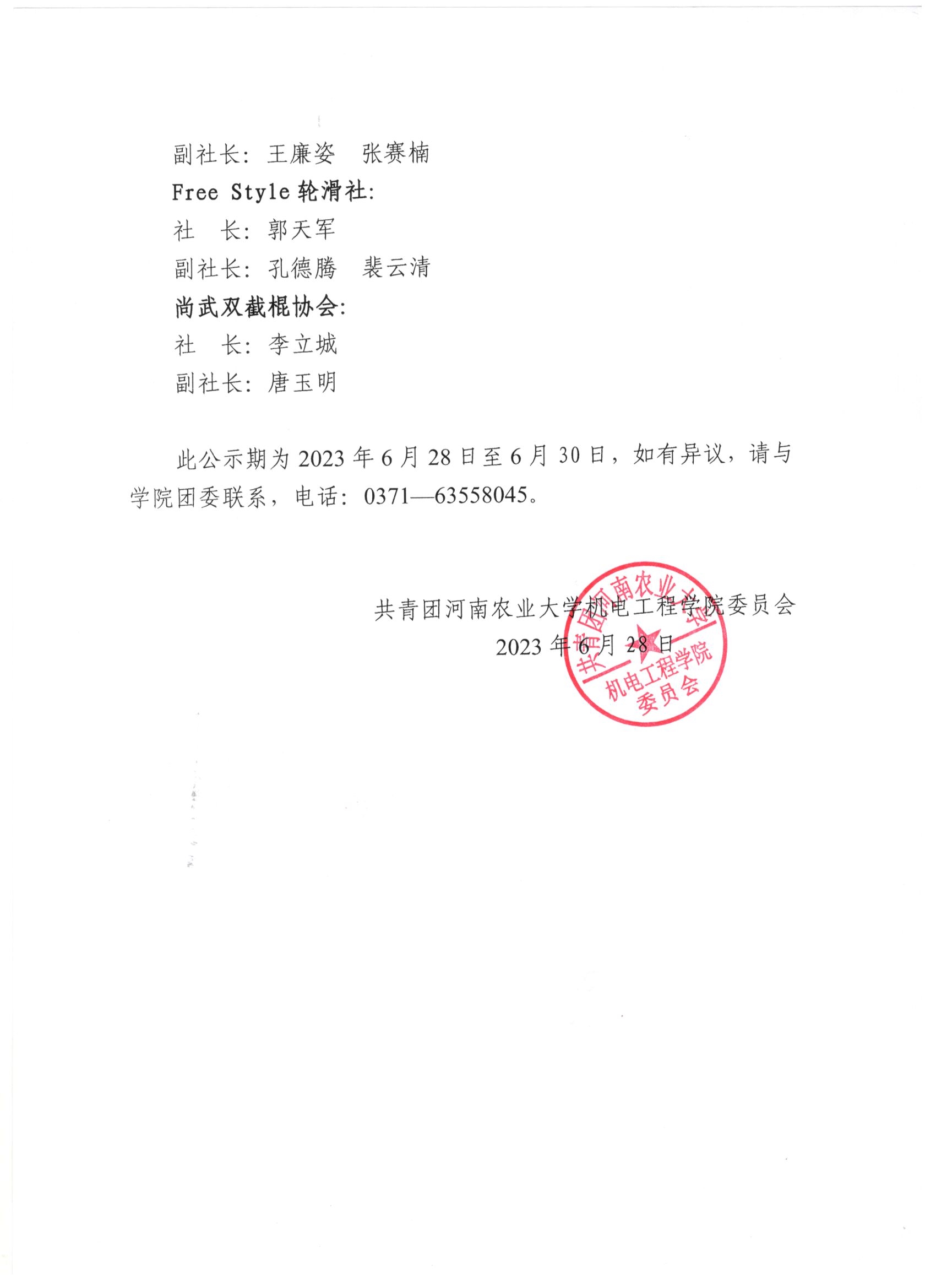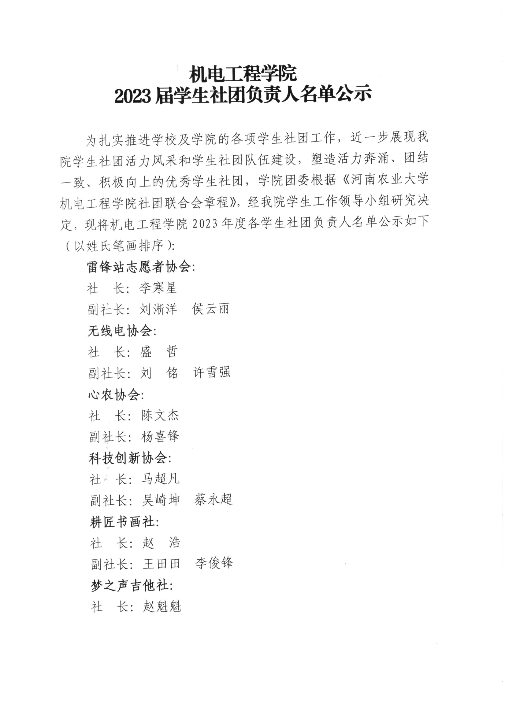为扎实推进学校及学院的各项学生社团工作,近一步展现91猫先生 学生社团活力风采和学生社团队伍建设,塑造活力奔涌、团结一致、积极向上的优秀学生社团,学院团委根据《91猫先生 91猫先生 社团联合会章程》,经91猫先生 学生工作领导小组研究决定,现将91猫先生 2023年度各学生社团负责人名单公示如下(以姓氏笔画排序):