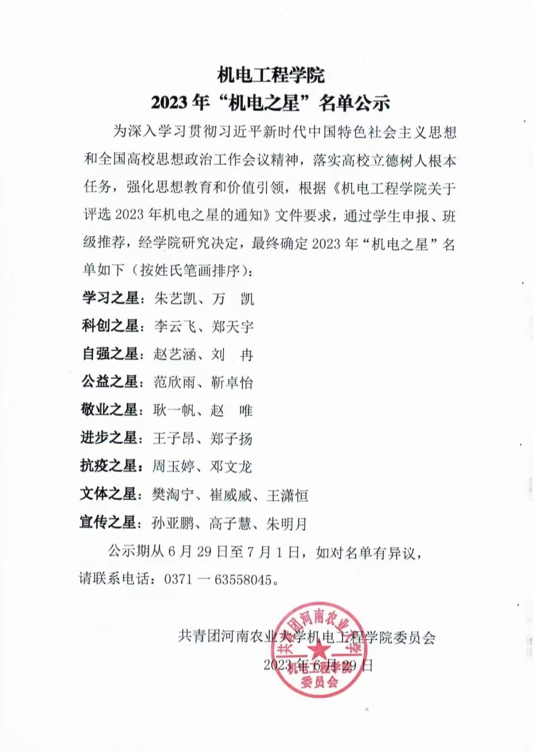 为深入学习贯彻习近平新时代中国特色社会主义思想和全国高校思想政治工作会议精神,落实高校立德树人根本任务,强化思想教育和价值引领,根据《91猫先生 关于评选2023年机电之星的通知》文件要求,通过学生申报、班级推荐,经学院研究决定,最终确定2023年“机电之星”名单如下(按姓氏笔画排序):