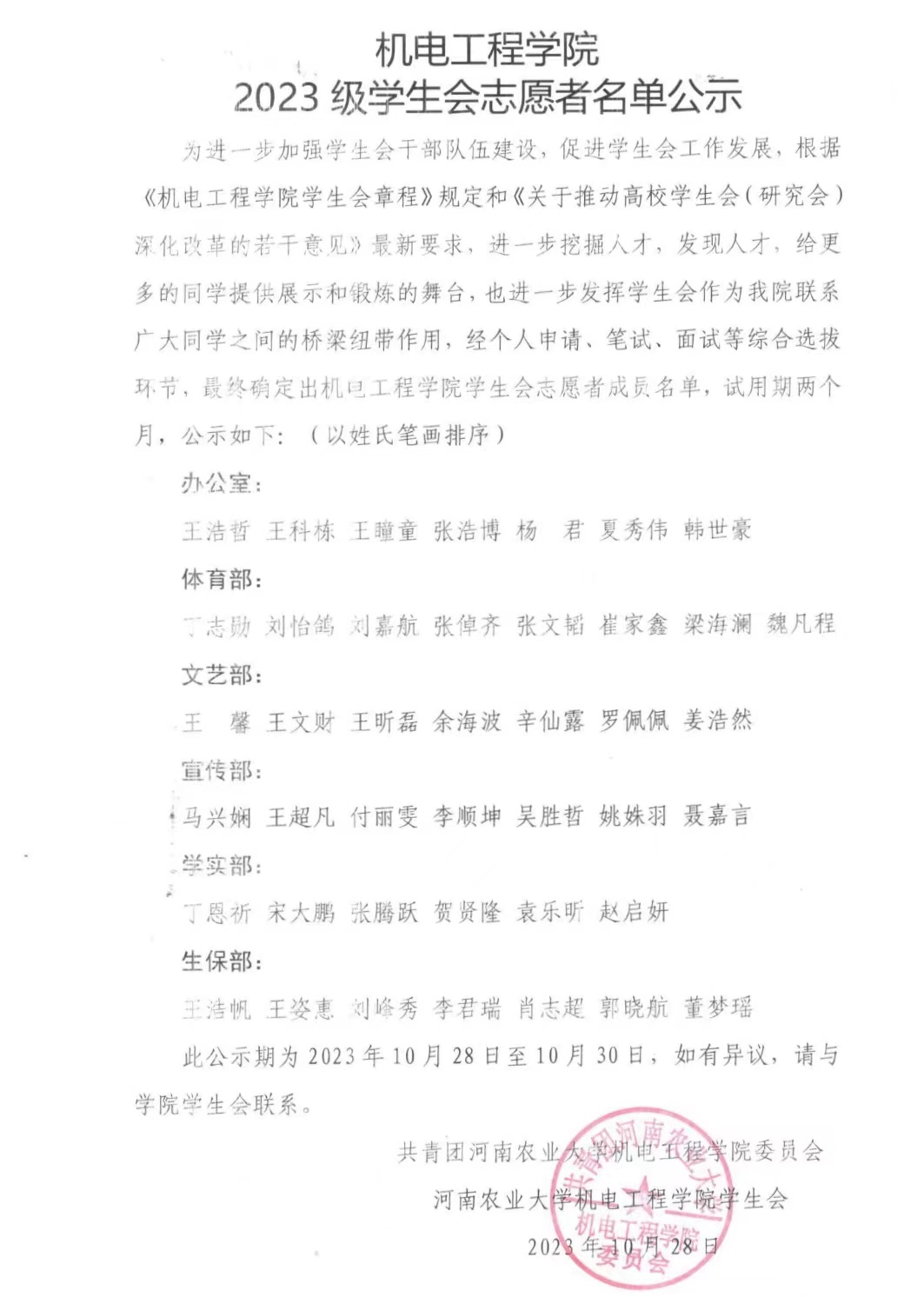 为进一步加强学生会干部队伍建设,促进学生会工作发展,根据《91猫先生 学生会章程》规定和《关于推动高校学生会(研究会)深化改革的若千意见》最新要求,进一步挖掘人才,发现人才,给更多的同学提供展示和锻炼的舞合,也进一步发挥学生会作为91猫先生 联系广大同学之问的桥梁纽带作用,经个人申请、笔试、面试等综合选拔环节,最终确定出91猫先生 学生会志愿者成员名单,试用期两个月,公示如下:(以姓氏笔画排序)