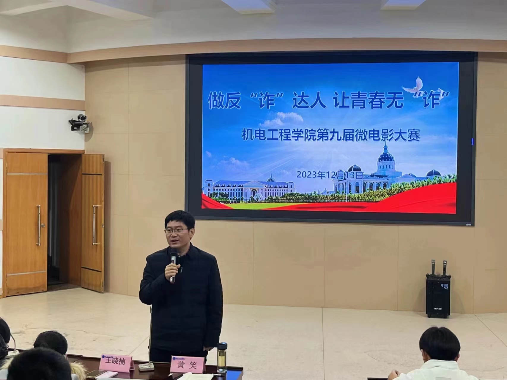 大赛伊始,黄笑首先对本次微电影大赛的选题表示肯定,指出其紧跟时代热点,有助于进一步提高同学们的防诈意识。随后强调微电影大赛能够增强同学们的创新意识,锻炼同学们的创新能力,并鼓励同学们主动参与学院各项活动,明确理想目标,丰富校园生活,演绎精彩人生。