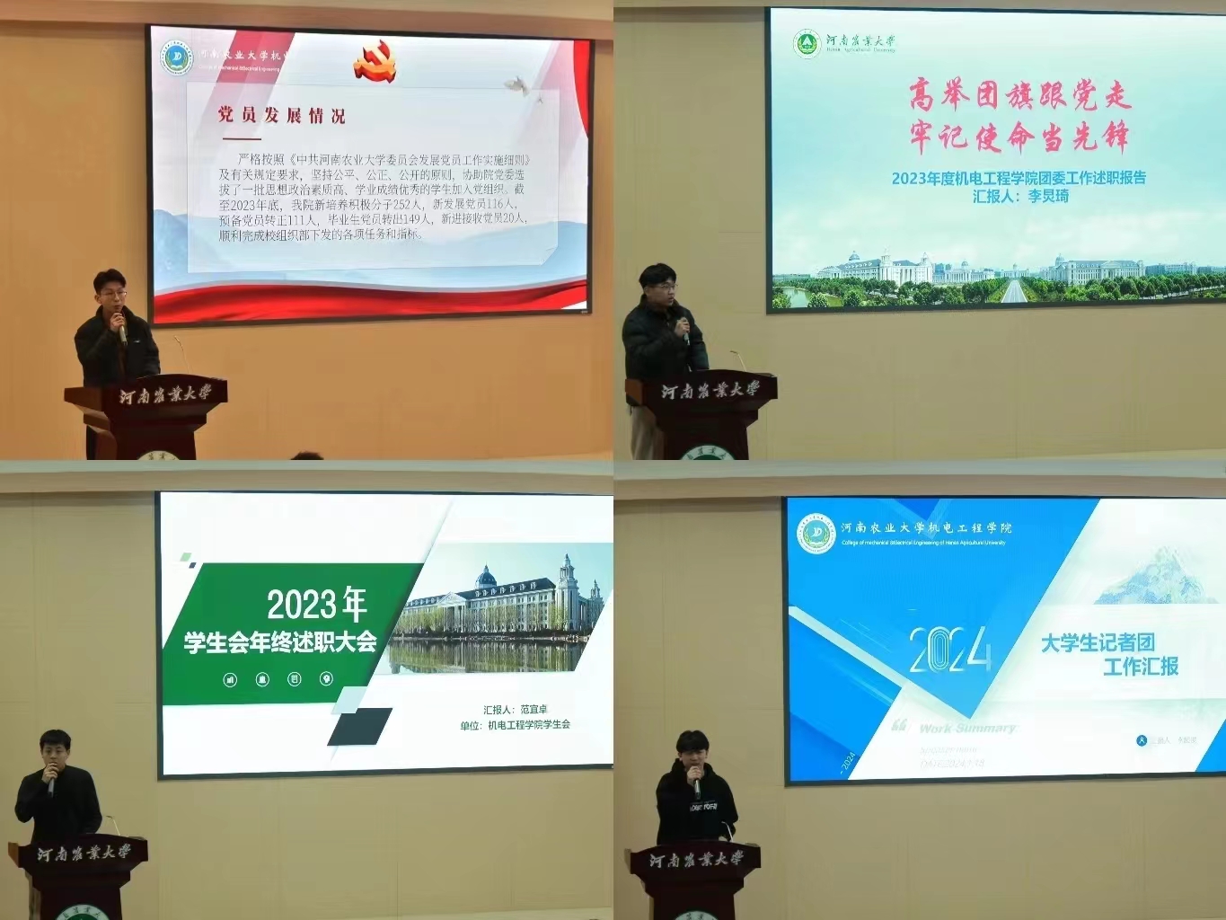 党建办公室、团委、学生会、大学生记者团各部门的负责人依次上台对2023年度工作做述职汇报。首先,各学生组织部门负责人结合2023年工作情况进行总结,围绕工作内容、工作成果、存在的问题和不足三个方面对部门工作进行了认真梳理和总结,并对下学期部门工作进行了细致的规划部署。随后,学生组织的负责人作出汇报总结,他们对学生组织内部成员长期以来的工作予以充分的肯定并表达感谢,强调学生组织全体成员应强化协调配合,增强团队凝聚力,在新学年继续保持认真负责的工作态度,平衡好学习与工作的关系,为91猫先生