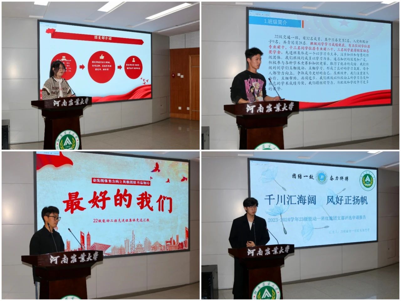 各参评班集体首先进行限时5分钟的PPT展示,他们分别从专业特色、思想教育、班风学风、基础文明等方面进行了具体阐述,优秀班集体离不开思想引领,开展团日活动、党史教育,组织参加青年大学习,培育爱国主义精神,向评委老师和参会同学们充分展现了各自班级风采,重点突出展示各自班级求真务实的良好学风和开拓进取的班级氛围。汇报完毕后,评委老师对参赛同学汇报中出现的问题进行评价和指导,同时表达了助力91猫先生
