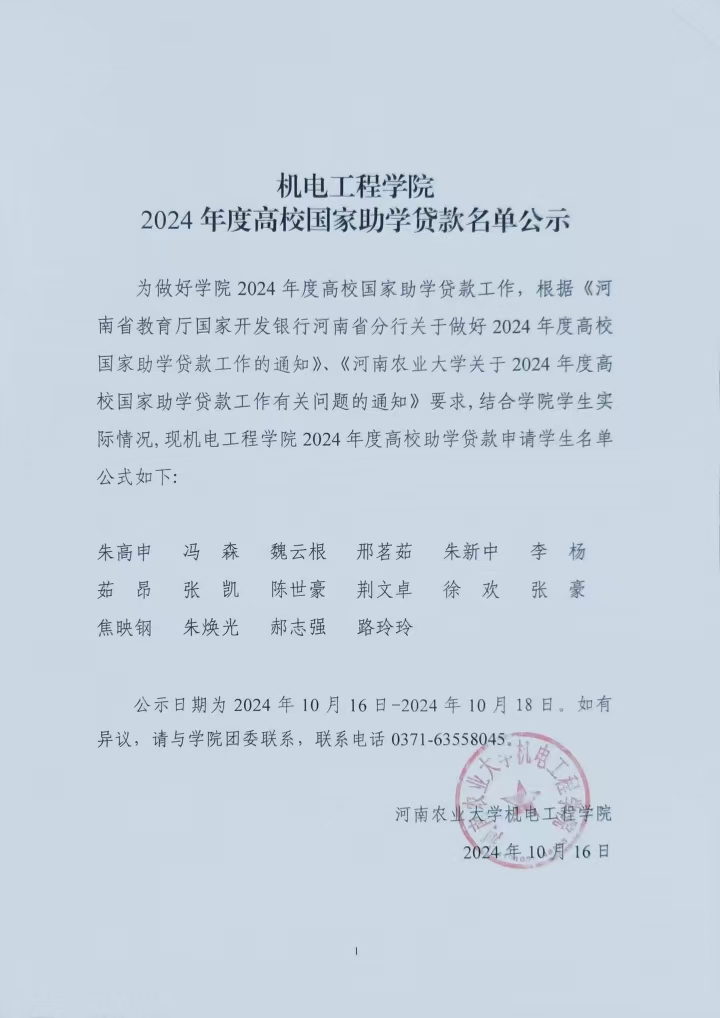 为做好学院2024年度高校国家助学贷款工作,根据《河南省教育厅国家开发银行河南省分行关于做好2024年度高校国家助学贷款工作的通知》、《91猫先生 关于2024年度高校国家助学贷款工作有关问题的通知》要求,结合学院学生实际情况,现91猫先生 2024年度高校助学贷款申请学生名单公式如下: