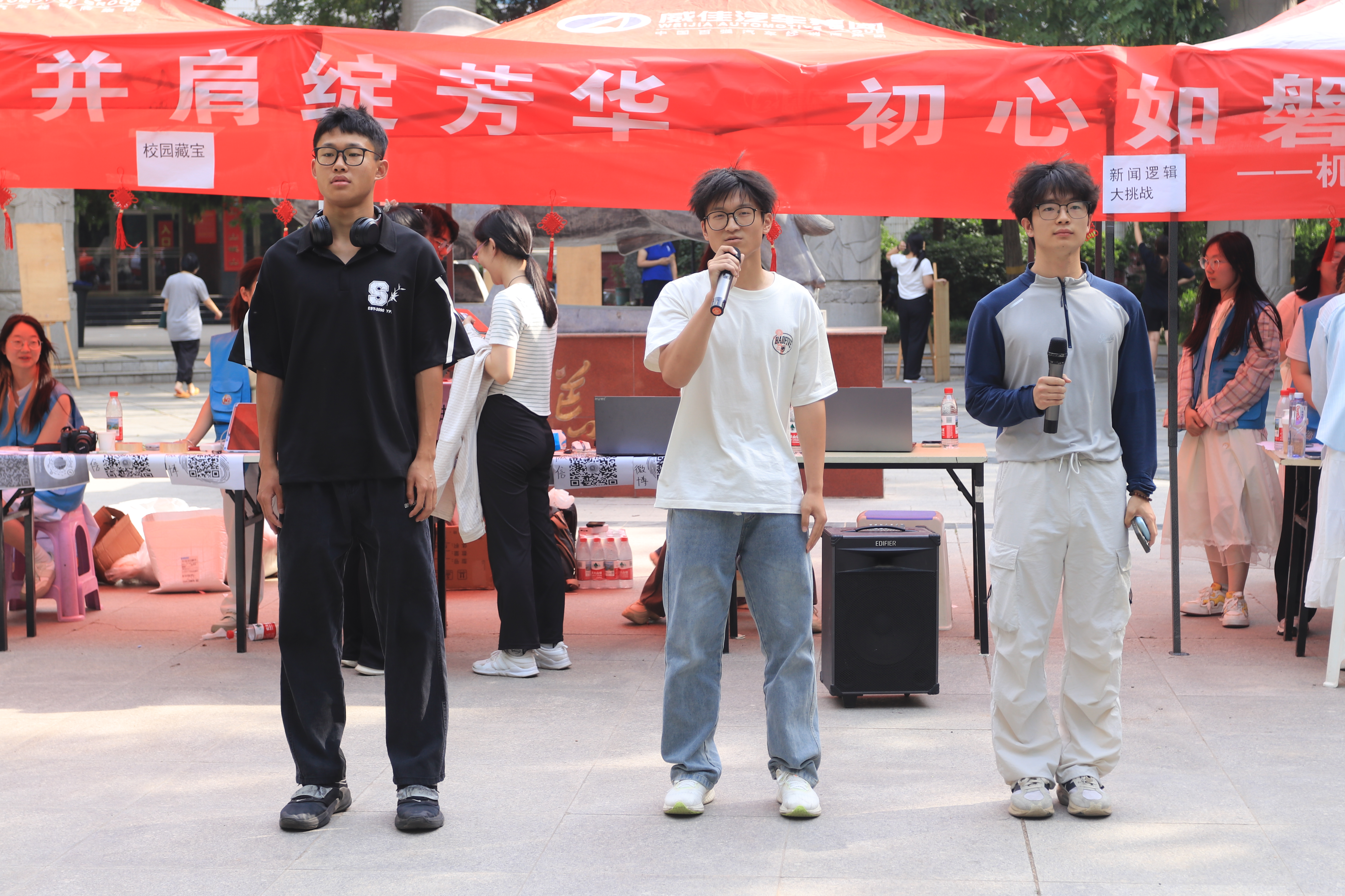 现场游戏环节热闹非凡,吸引众多师生踊跃参与。“校园藏宝”游戏别具一格,印有记者团特色标识的贺卡被巧妙地藏在校园各个角落。同学们穿梭于教学楼、操场等地,在寻宝过程中享受乐趣的同时,也增进了对校园环境的熟悉程度。“新闻逻辑大挑战”则聚焦专业能力,参与者需迅速梳理新闻线索、精准辨别信息真伪,在紧张刺激的挑战中提升新闻逻辑思维。此外,“文字判官”“重生之我是记者”“水杯乒乓球”等游戏同样趣味十足,现场欢声笑语不断。