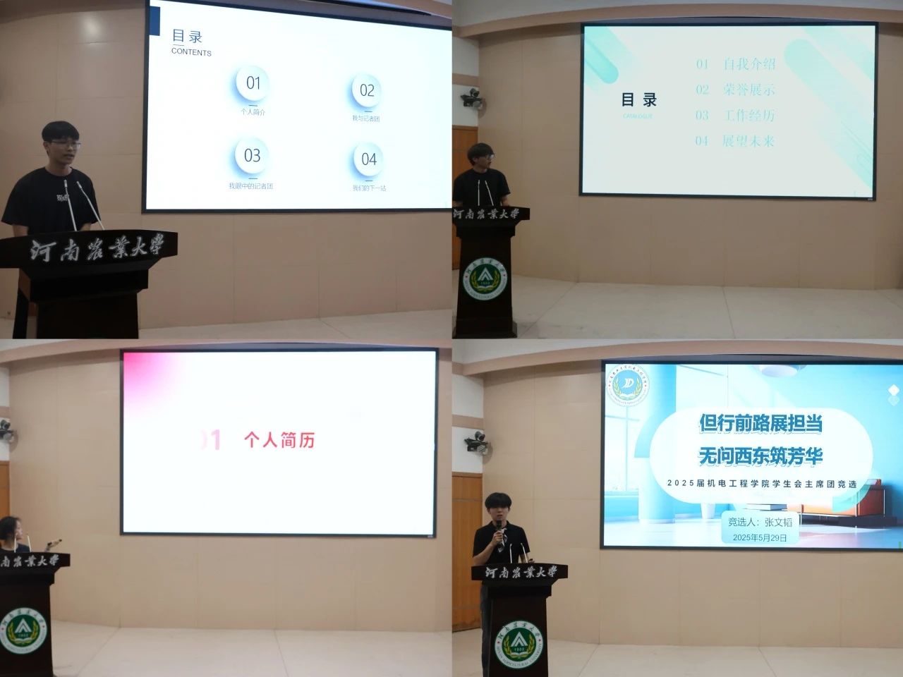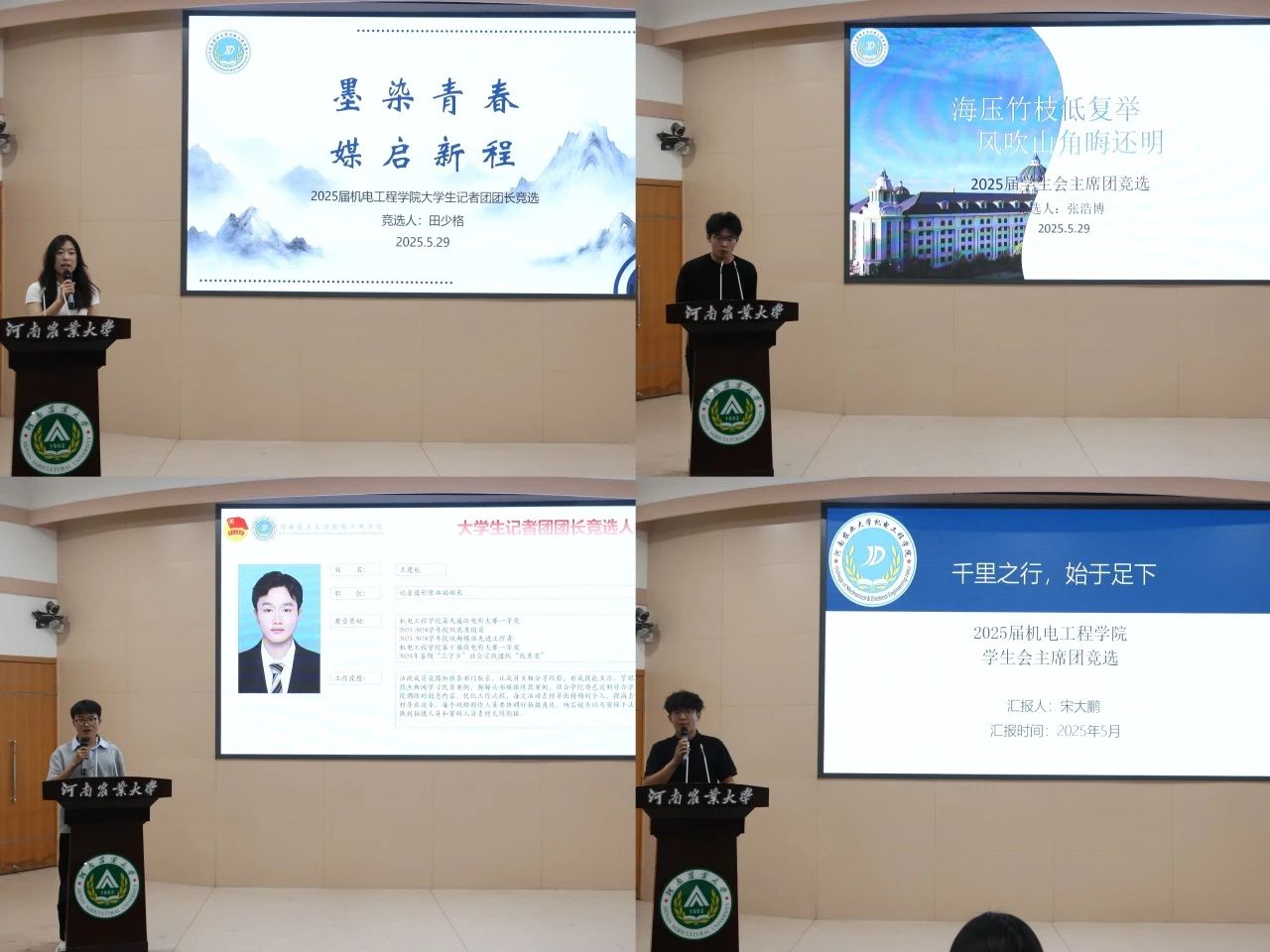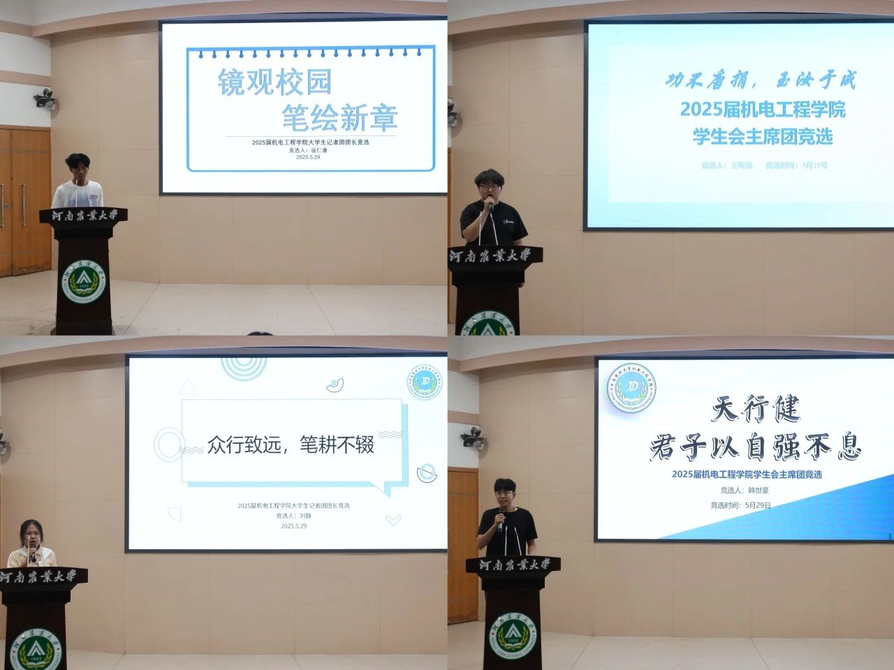 竞选开始后,参与本次竞选的14位同学依次登台发言,分享自己对团队发展的见解、规划。在自由抽题回答中,每位竞争者思路清晰、论证严密、谈吐流畅,获得了评委老师的肯定,展现了学生组织成员出色的工作能力与蓬勃的青春朝气。