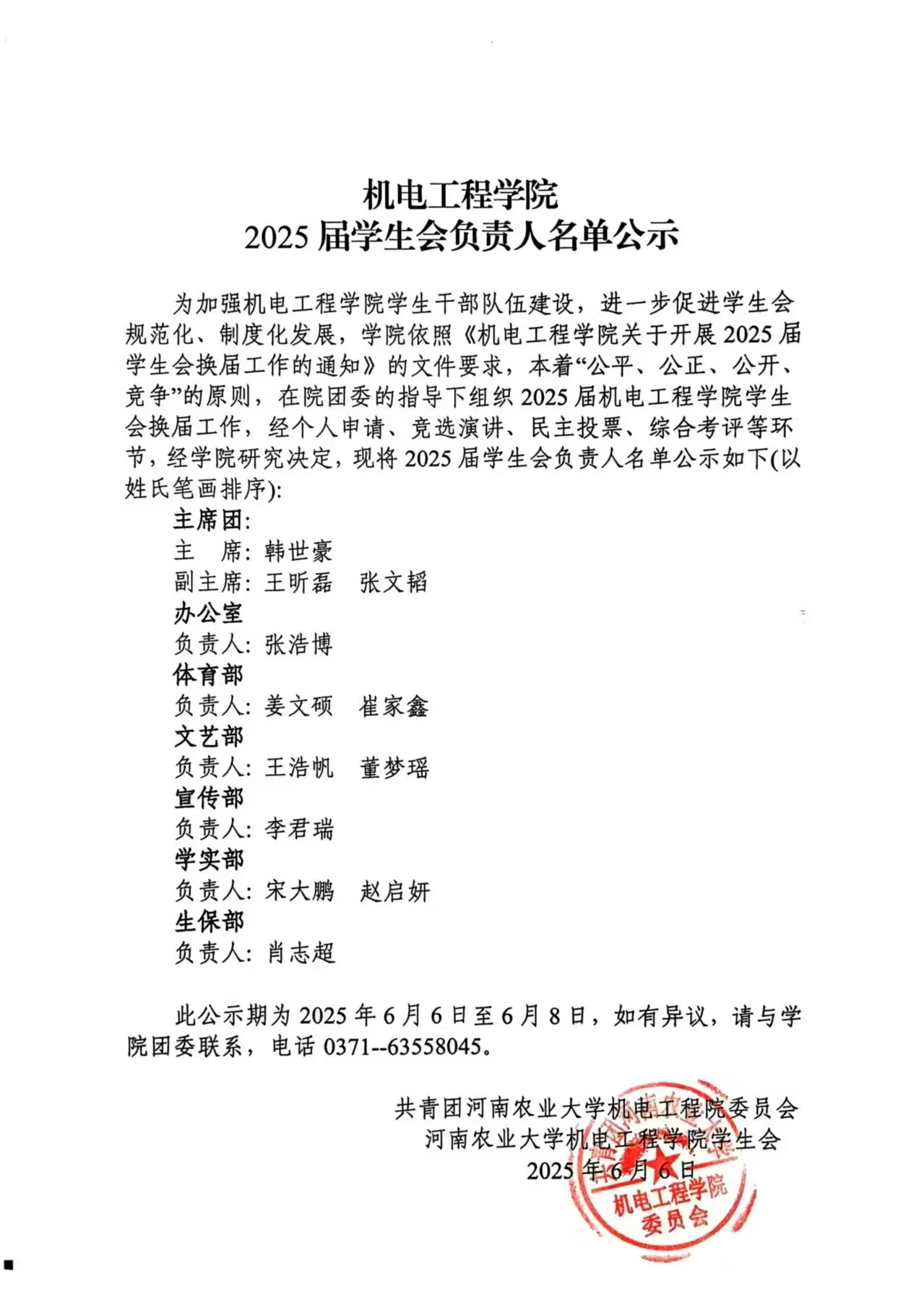 为加强91猫先生 学生干部队伍建设,进一步促进学生会规范化、制度化发展,学院依照《91猫先生 关于开展2025届学生会换届工作的通知》的文件要求,本着“公平、公正、公开、竞争”的原则,在院团委的指导下组织2025届91猫先生 学生会换届工作,经个人申请、竞选演讲、民主投票、综合考评等环节,经学院研究决定,现将2025届学生会负责人名单公示如下(以姓氏笔画排序):