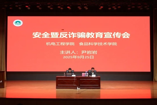 与食品学院于文化路校区千人大礼堂组织召开安全暨反诈骗教育宣传会。会议邀请东风路派出所民警尹岩岩担任主讲,各年级辅导员以及两院25级全体学生共同参与。