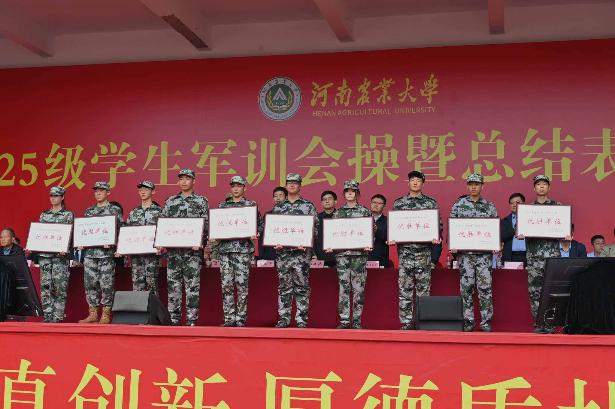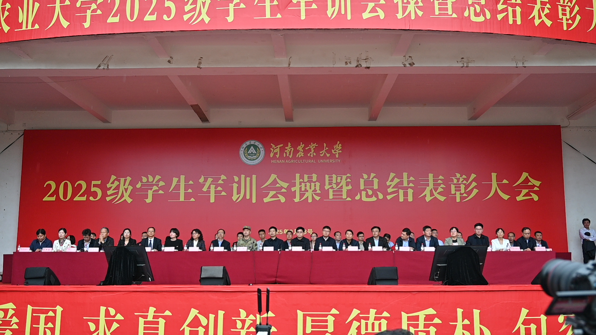 2025级学生军训会操暨总结表彰大会在文化路校区举行。校党委副书记、工会主席邹松涛,副校长郭战伟,承训部队领导吕博出席大会。学校学生工作委员会成员单位负责人,各学院学生工作负责人、辅导员,2025级学生参加大会。