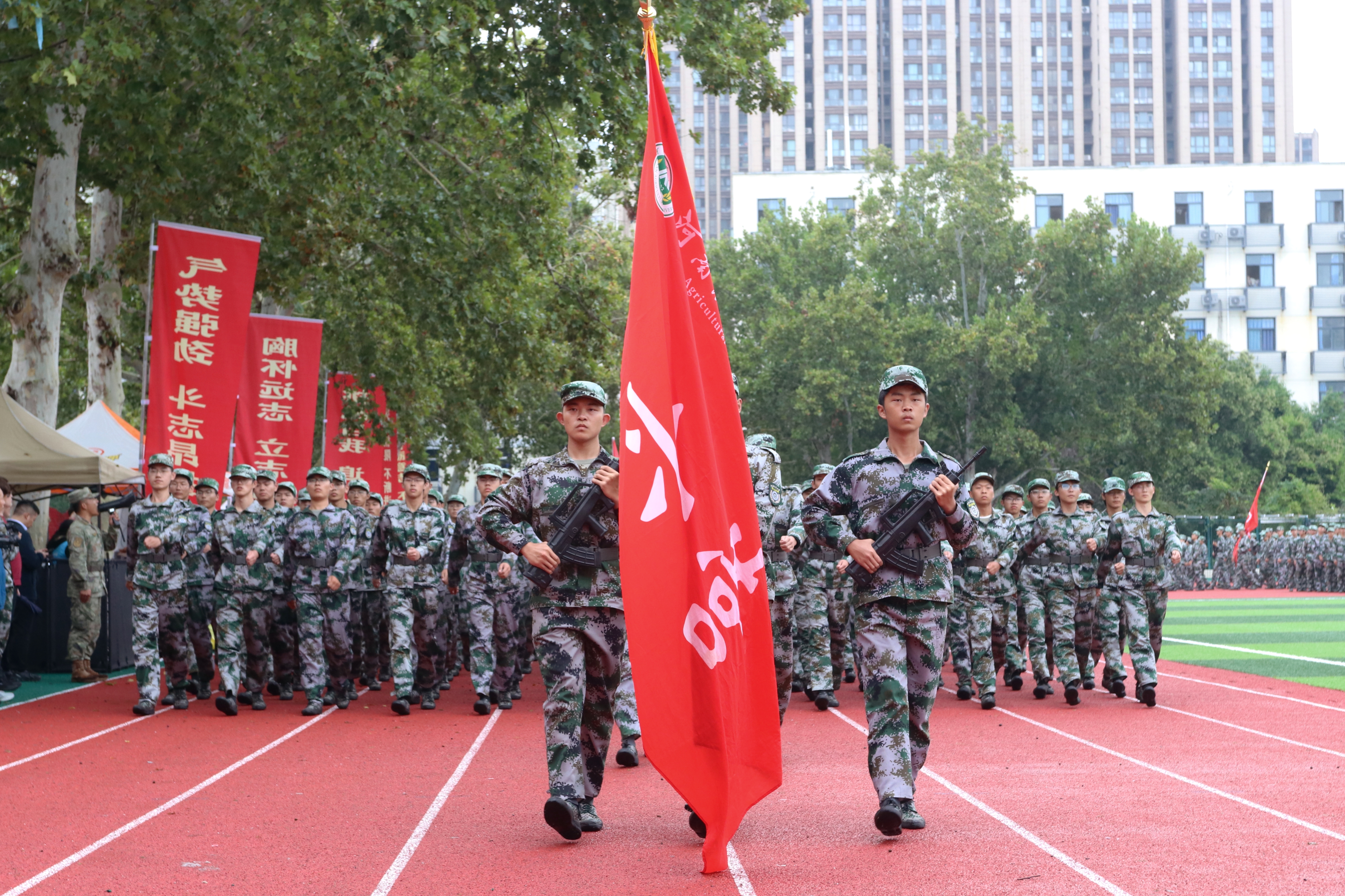 在庄严的国歌声中,全体师生肃穆伫立。随后,各学院方阵依次入场,步履铿锵,队列整齐划一。同学们昂首阔步,目光坚毅,以饱满的精神风貌接受检阅,每一步都踏出了青年学子的飒爽英姿与军训淬炼的坚毅风采。