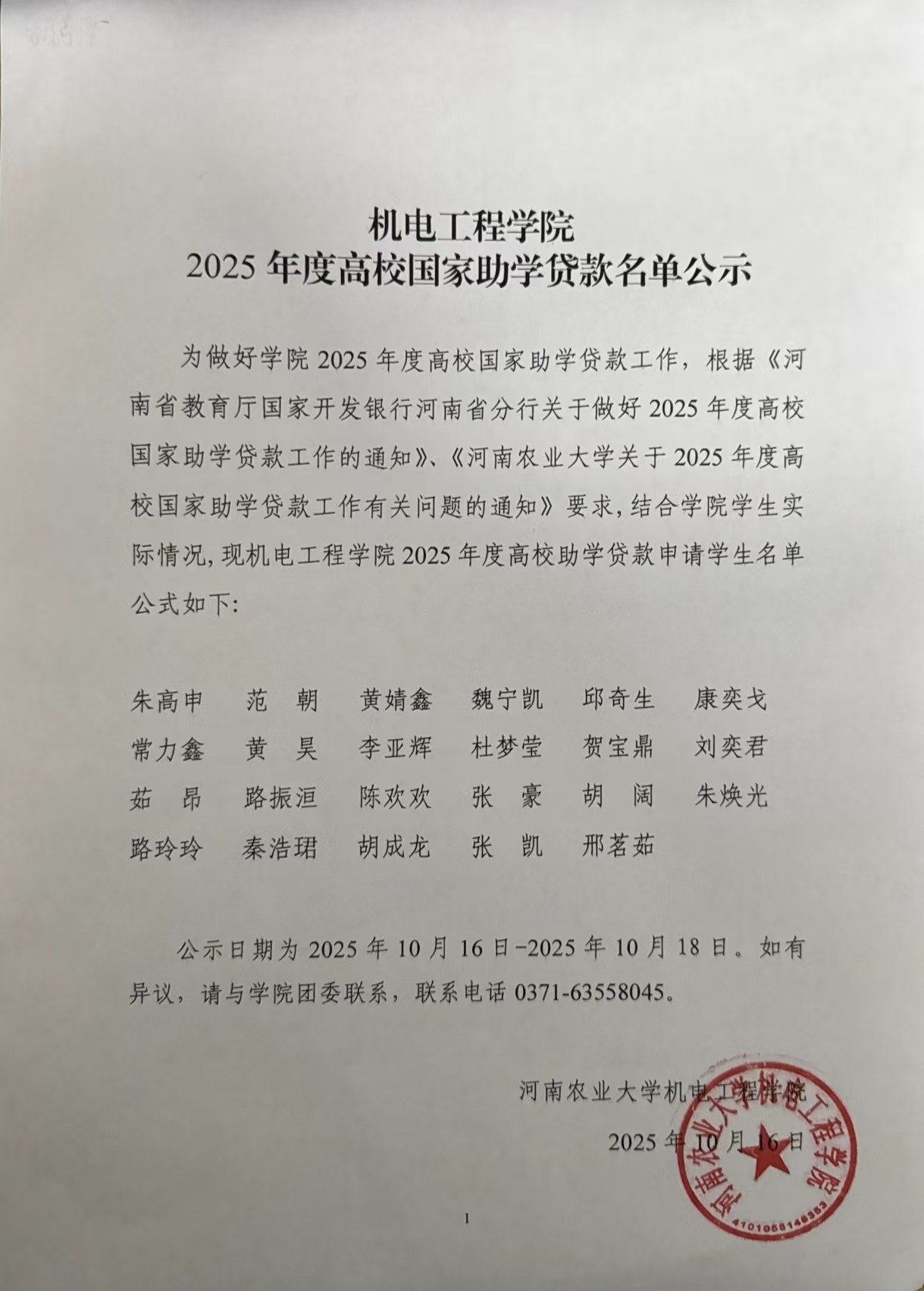 为做好学院2025年度高校国家助学贷款工作,根据《河南省教育厅国家开发银行河南省分行关于做好2025年度高校国家助学贷款工作的通知》、《91猫先生 关于2025年度高校国家助学贷款工作有关问题的通知》要求,结合学院学生实际情况,现91猫先生 2025年度高校助学贷款申请学生名单公式如下: